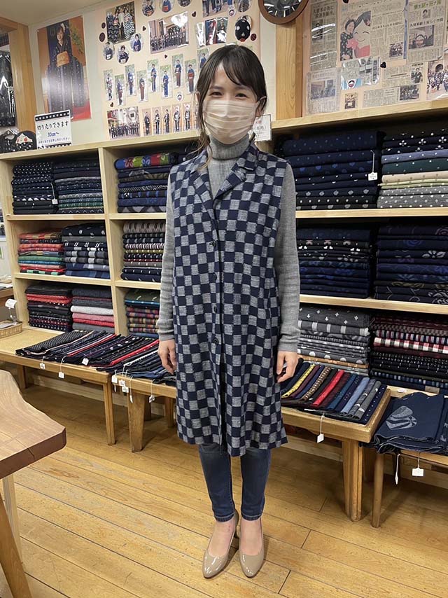 市松柄の久留米絣を使用したロングベストです。