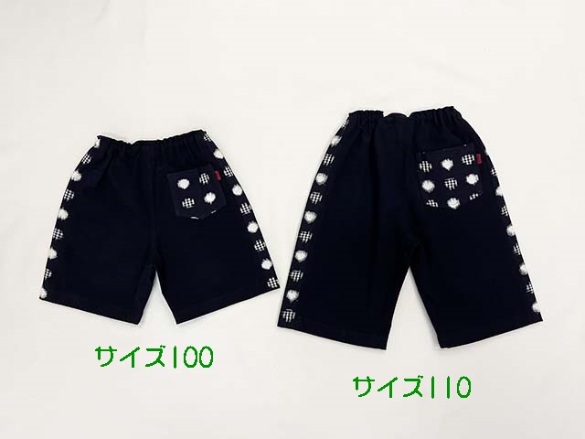 濃紺に白の格子水玉柄の久留米絣を両サイドと後ポケットに使用、それ以外は濃紺無地の久留米絣を使用したショートパンツです。