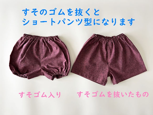 すその入れ替え口からゴムを抜くことができるため、お子様が大きくなられましたら、ゴムを外して、ショートパンツとしてお使いください。