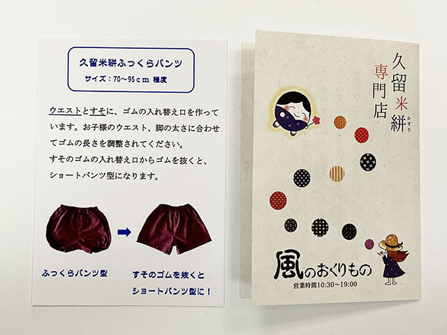 ●「ふっくらパンツの説明のしおり」と「久留米絣の説明のしおり」を同封します
