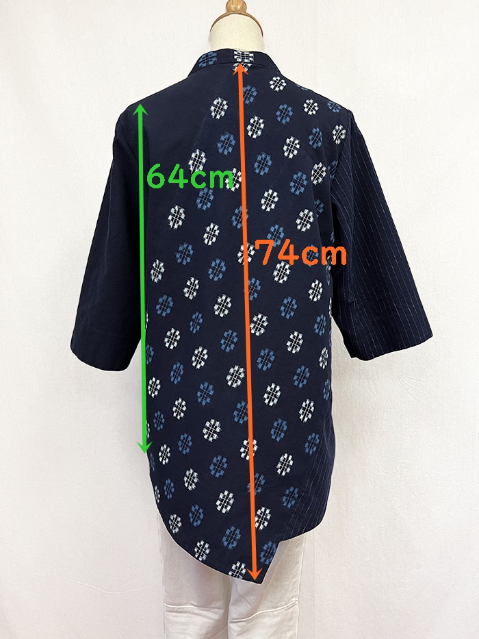 袖には右がストライプ、左は紺無地の久留米絣を使用しています。同系色のため派手過ぎず、とてもオシャレです。