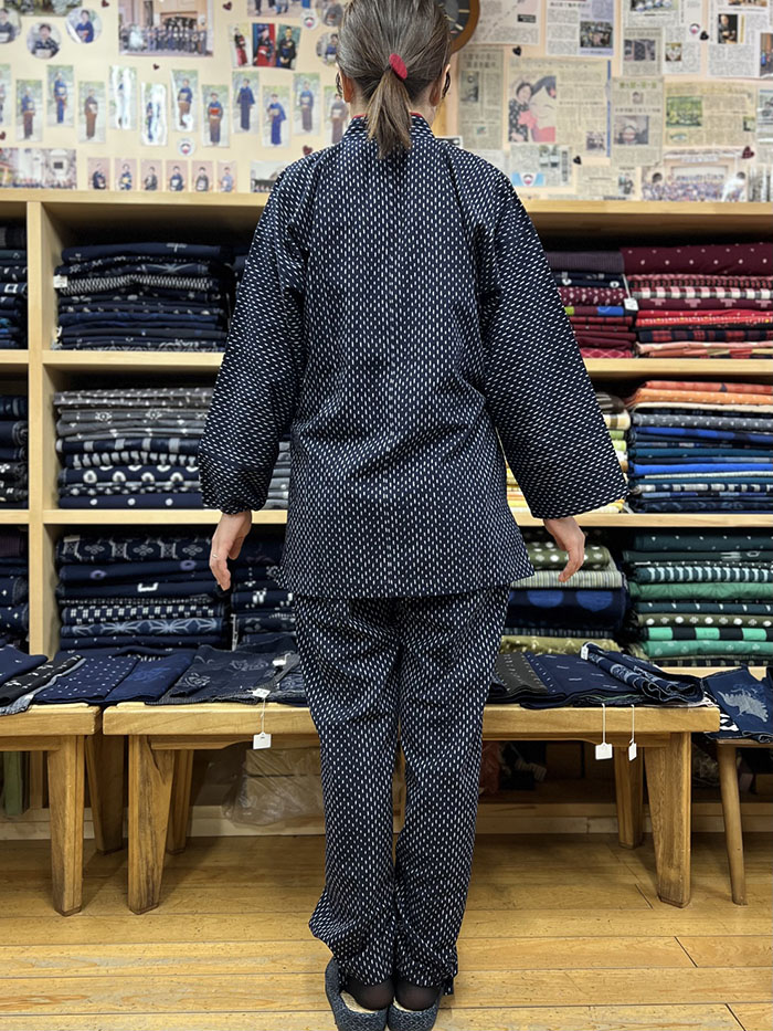 久留米絣(かすり)の作務衣、上下セット(女性用フリーサイズ)です。