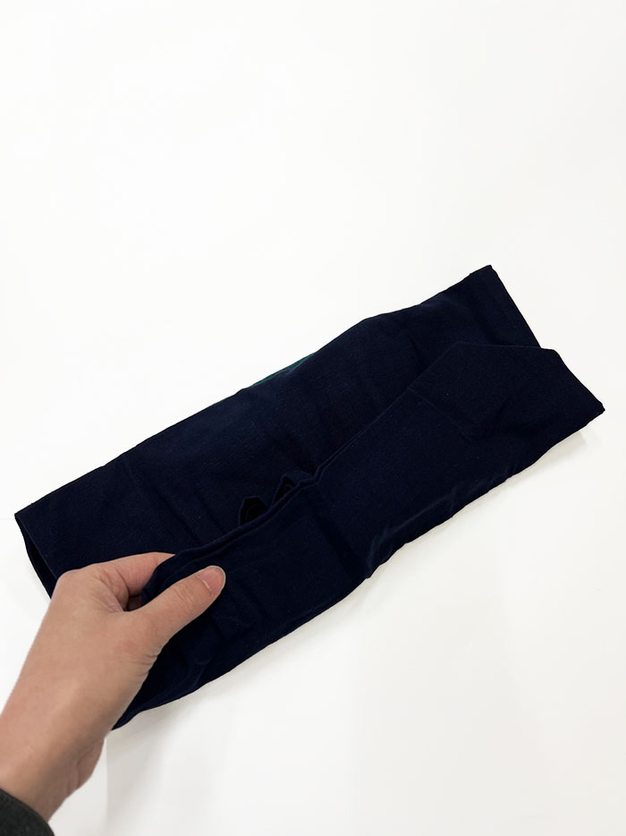 折り畳んでポケット部分でくるんでボタンを留めるつくりです。