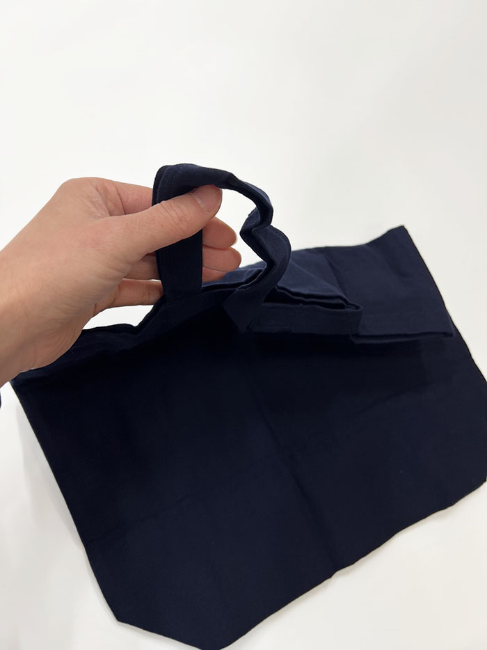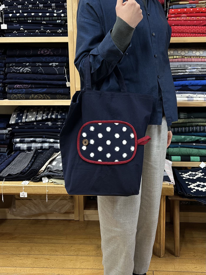 バッグ本体と紐は、紺無地の久留米絣を使用しています。