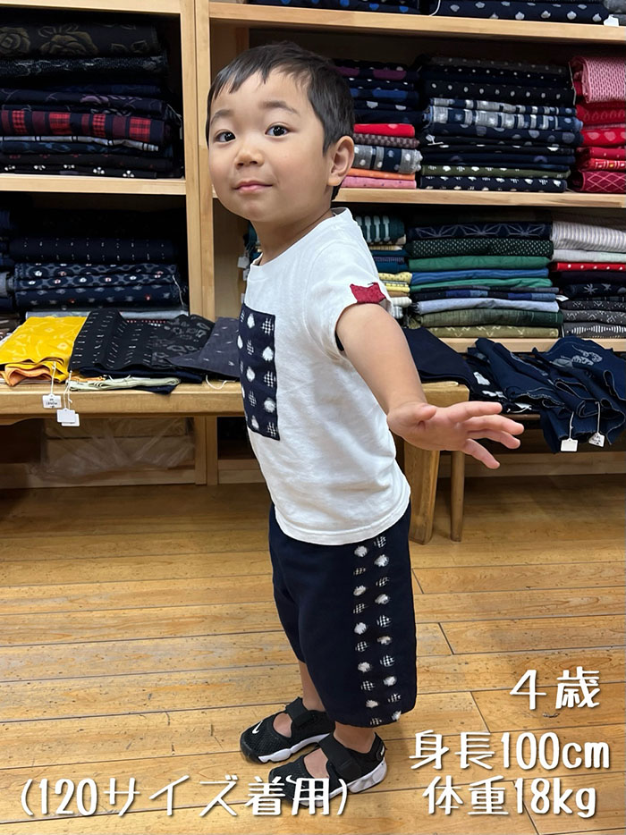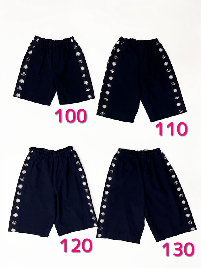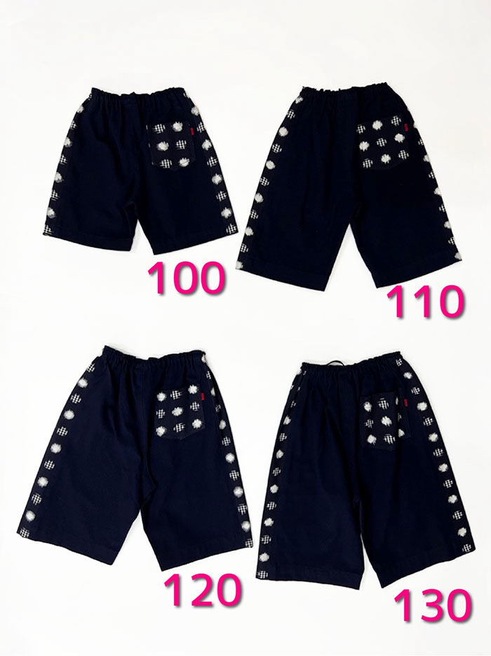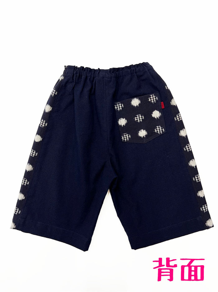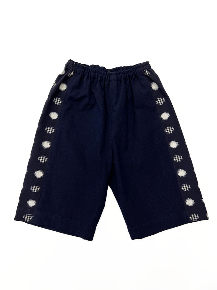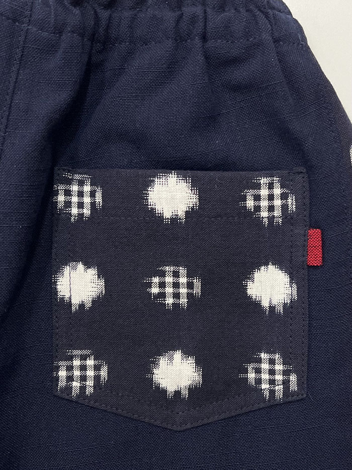 濃紺無地の久留米絣と、両サイドとポケットに水玉格子柄の久留米絣を使用した、子供用ショートパンツです。