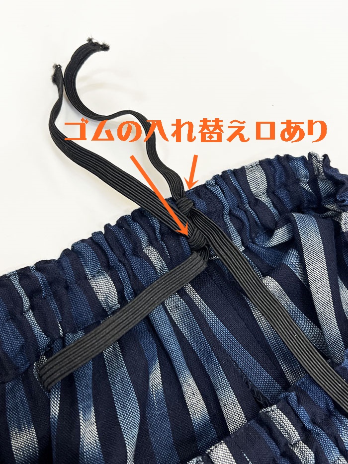 ウエストはお好みのサイズに調整できます。(ゴムの入れ替え口からゴムの結び目を出していますので、お好みの締め具合いに調整されて、調整後不要なゴムはカットしてください。)