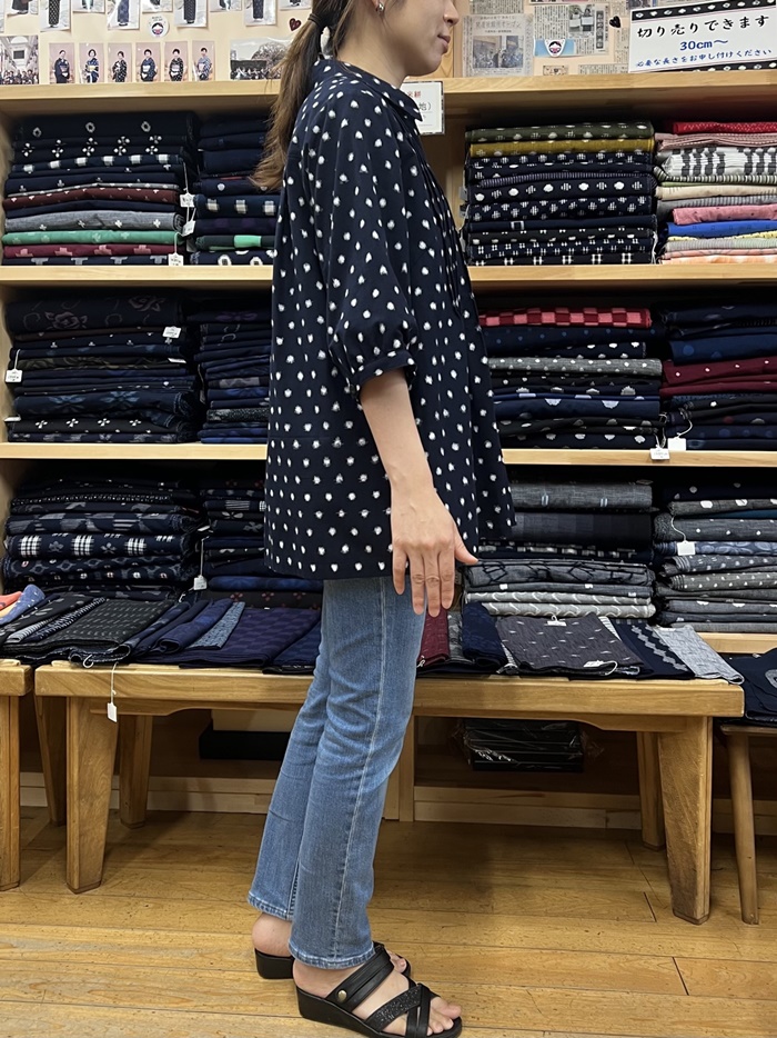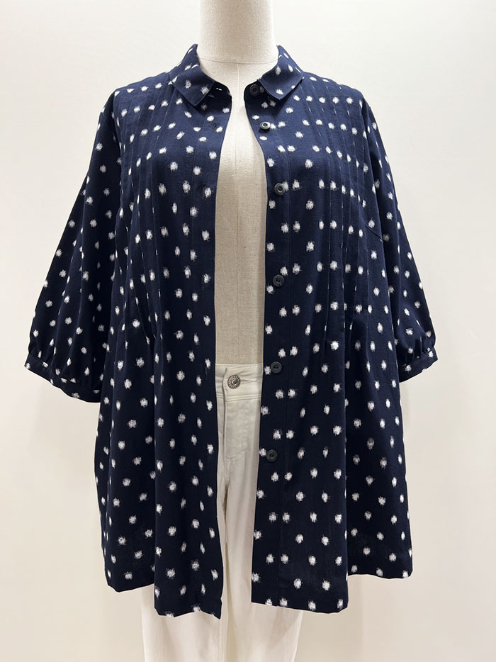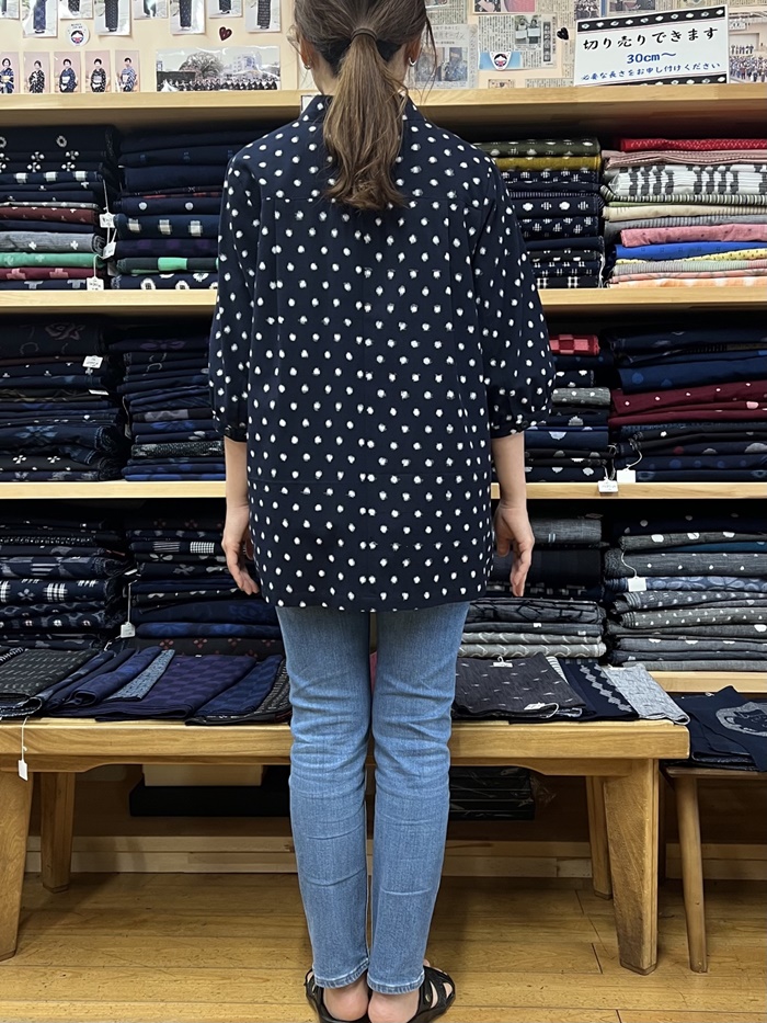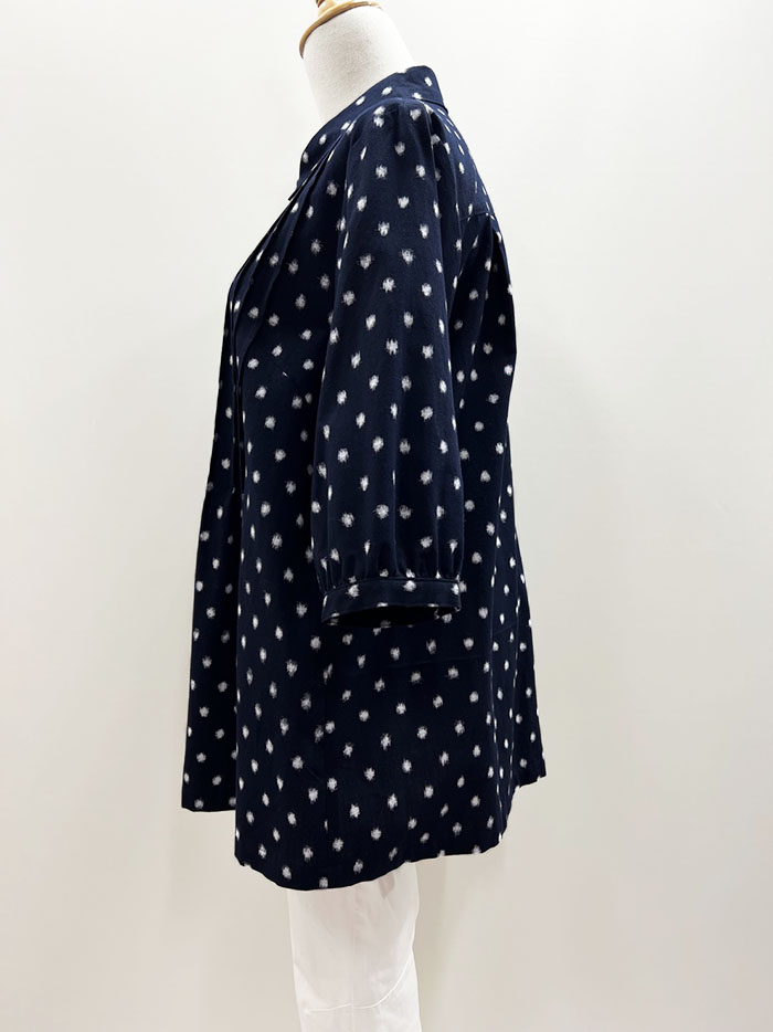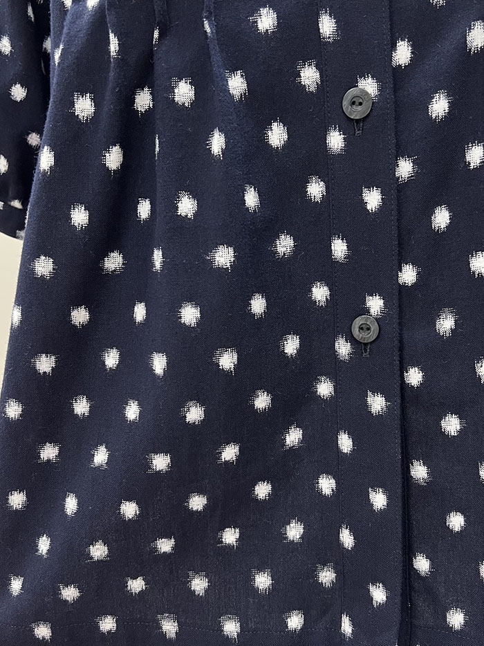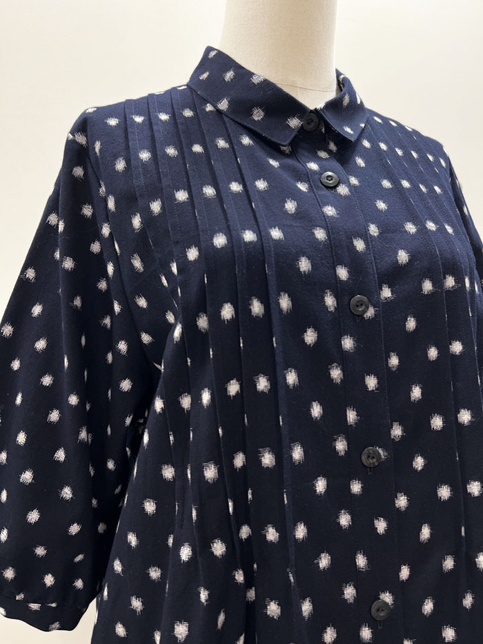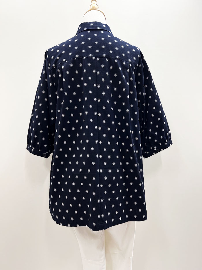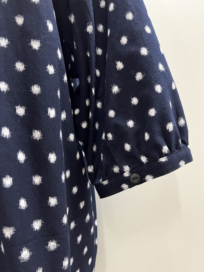 紺地に白の水玉柄が映える、久留米絣のブラウスです。