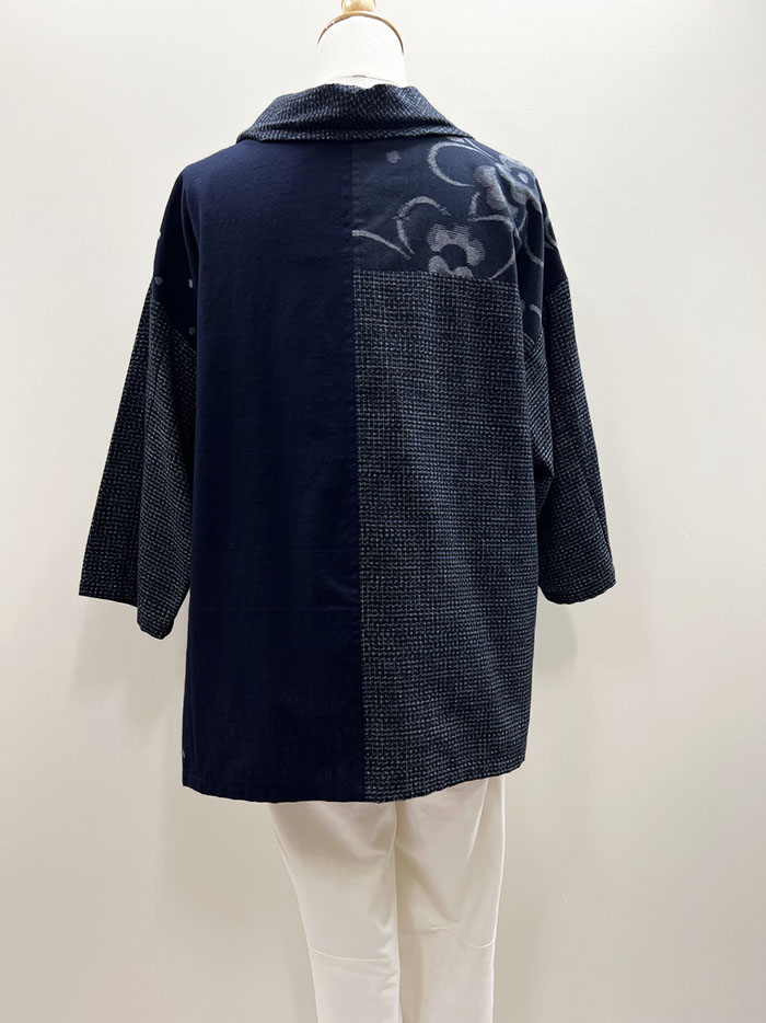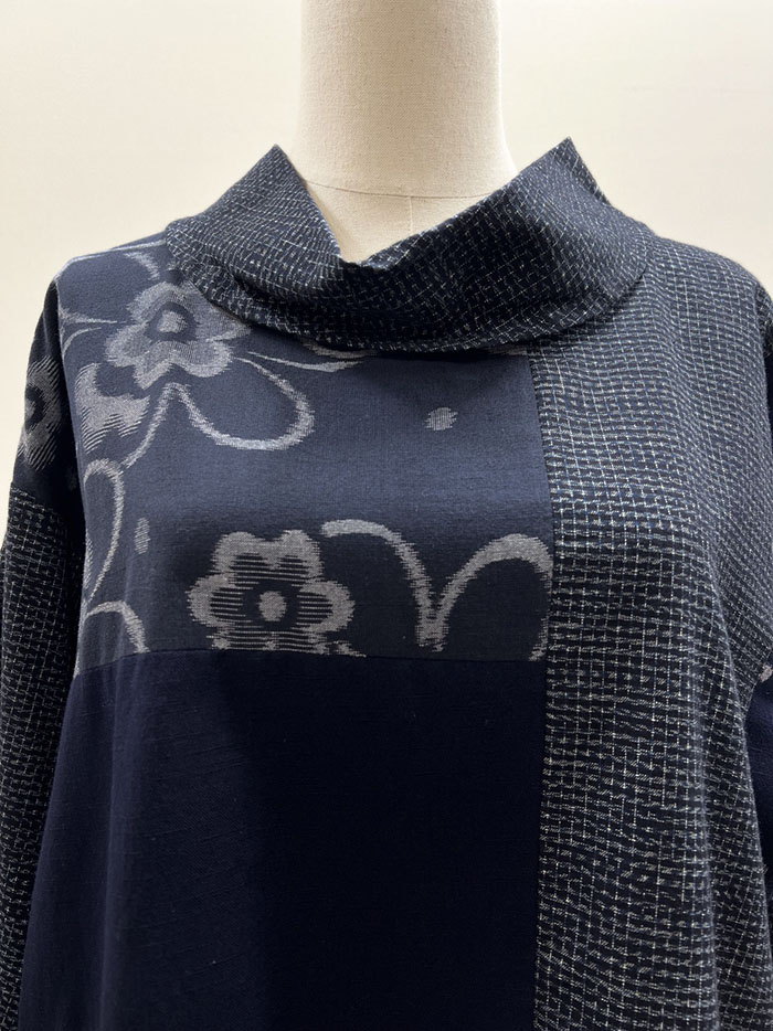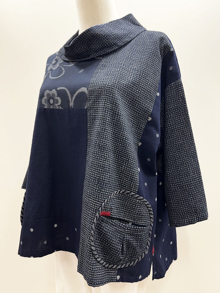 ロール襟がオシャレな、久留米絣のかぶりブラウスです。
