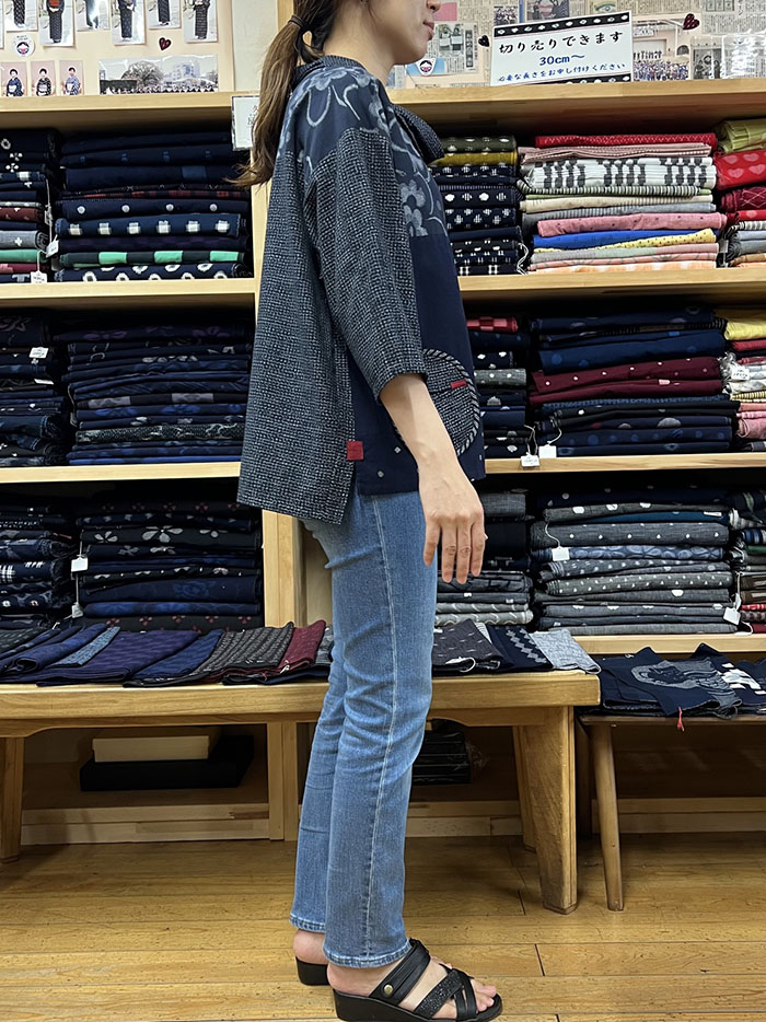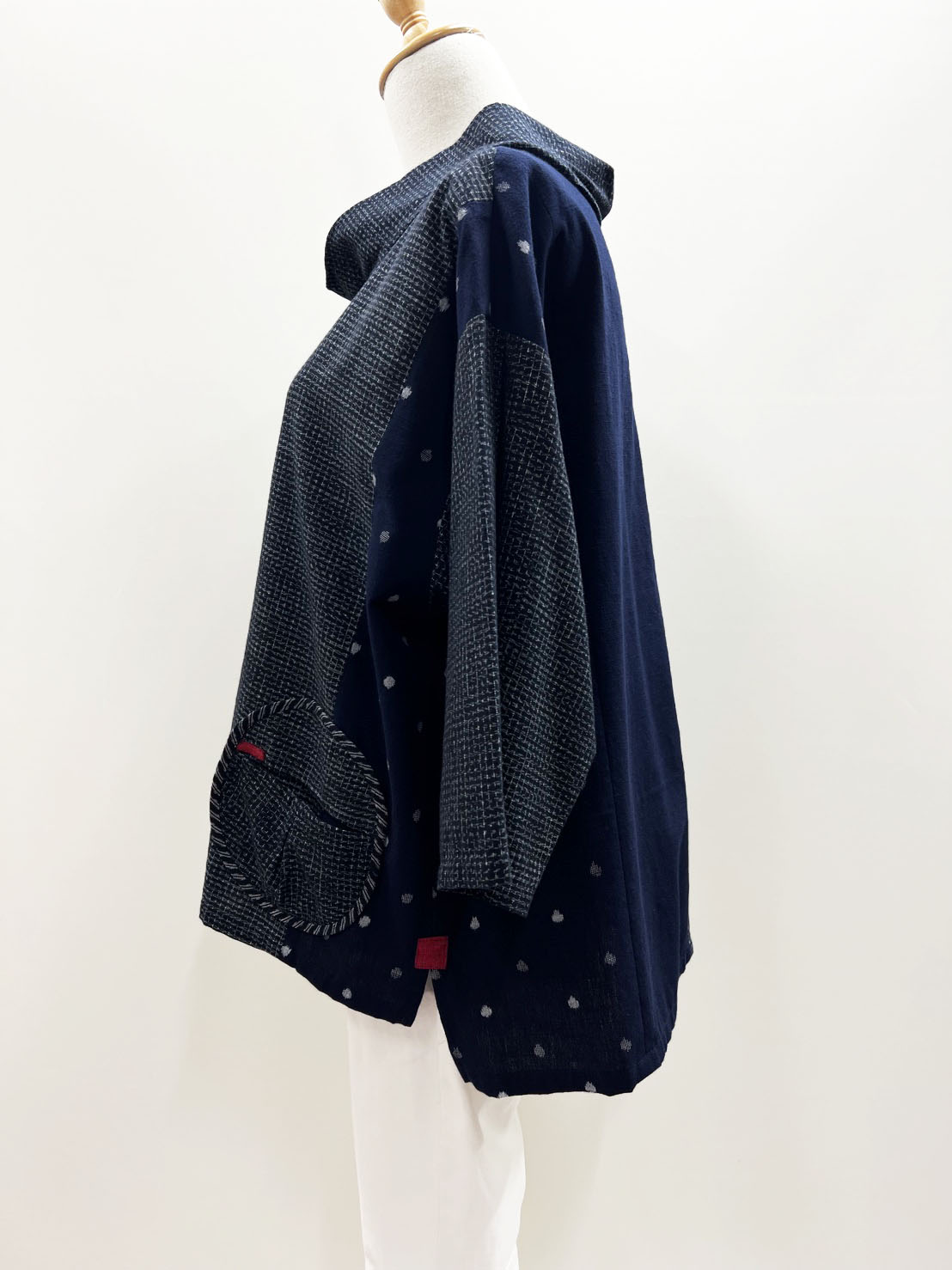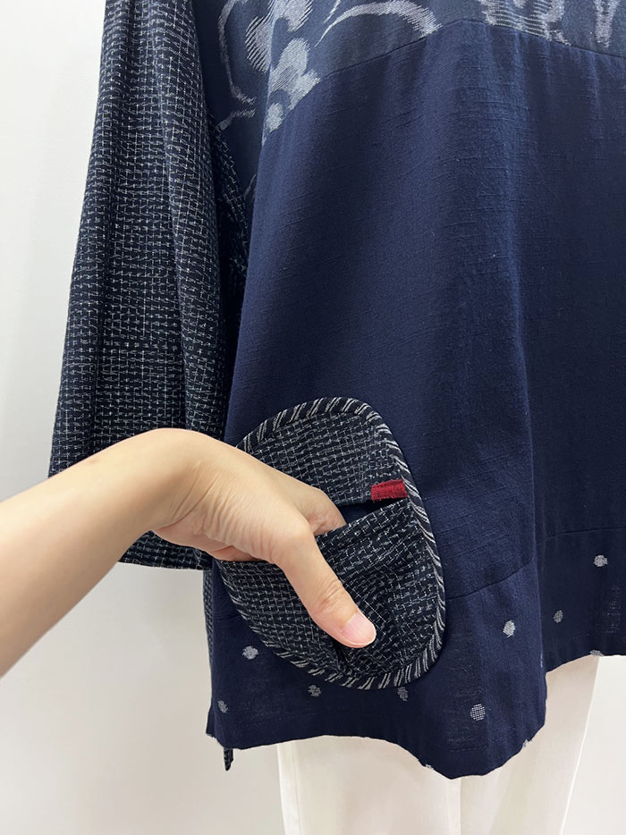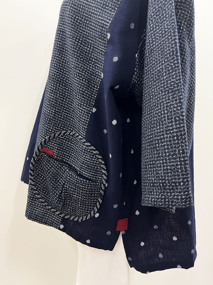 左右に付いた文人柄の丸い貼りポケットが可愛らしく、ポケットと両サイドのスリット部分に付いた赤の絣もポイントになっています。