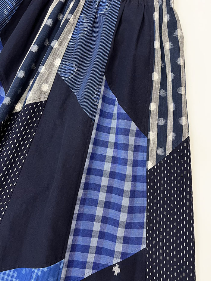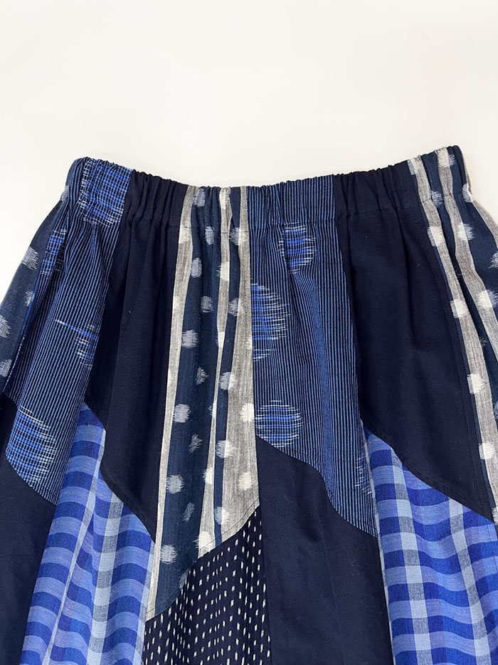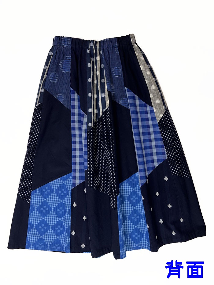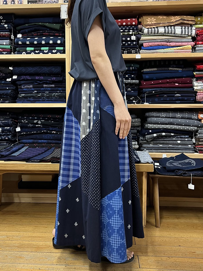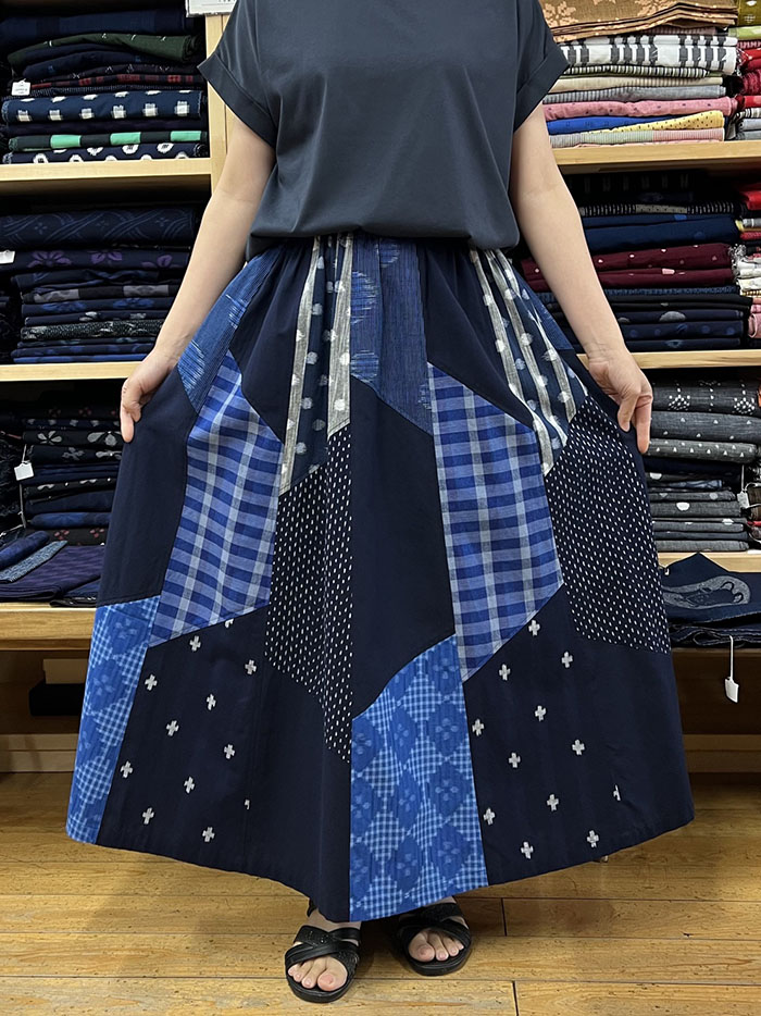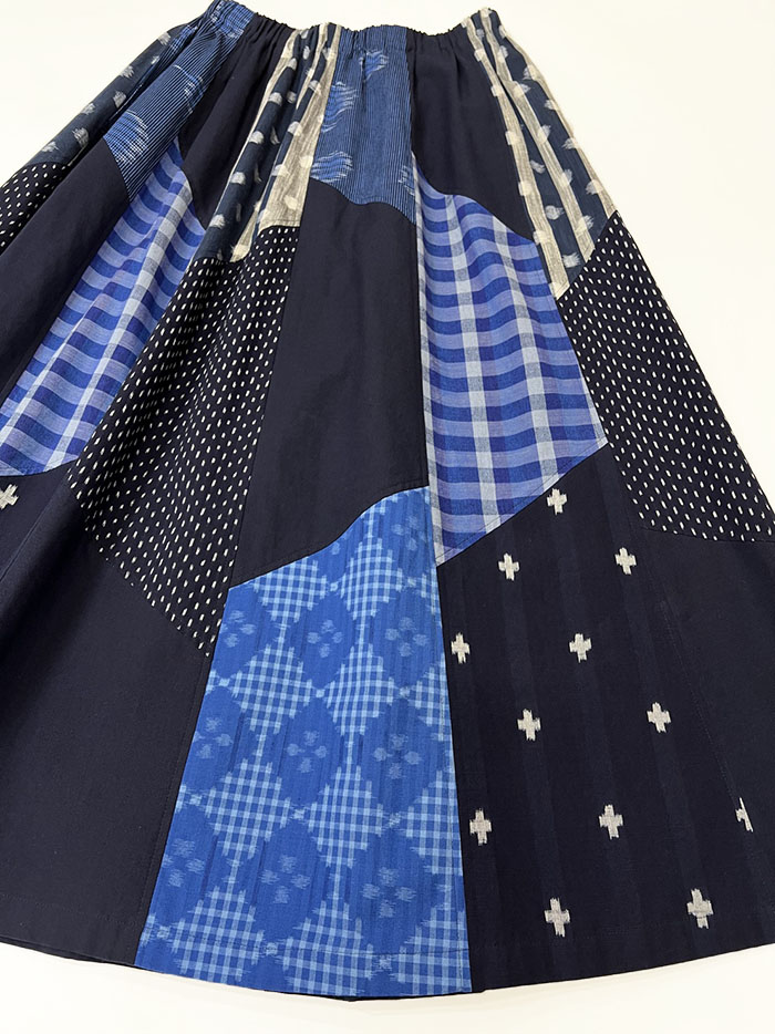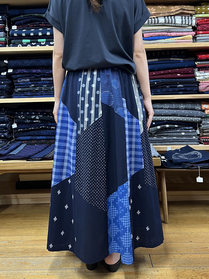 紺・ブルー系の久留米絣を組み合わせて仕立てられた、久留米絣のロングスカートです。