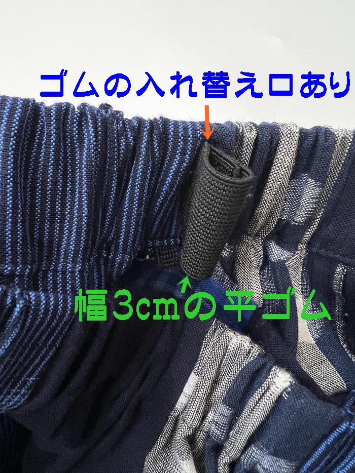 *ウエスト総ゴム(幅3cmの平ゴムが入っています)※ゴムの入れ替え口あり