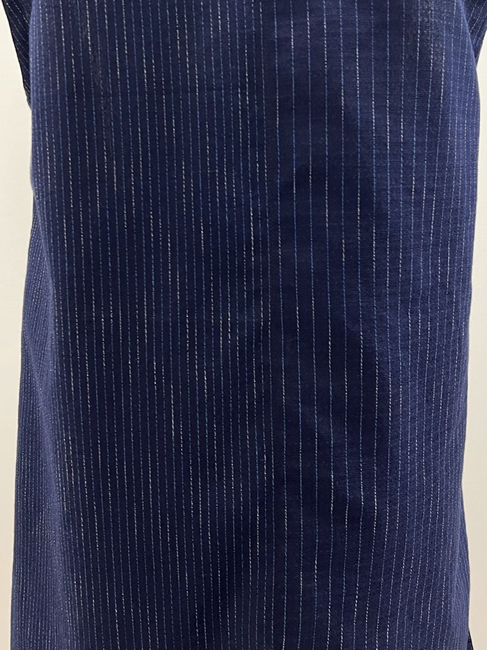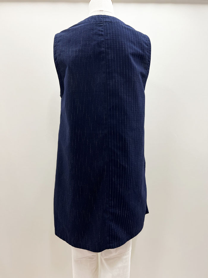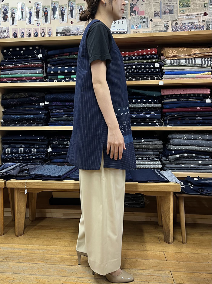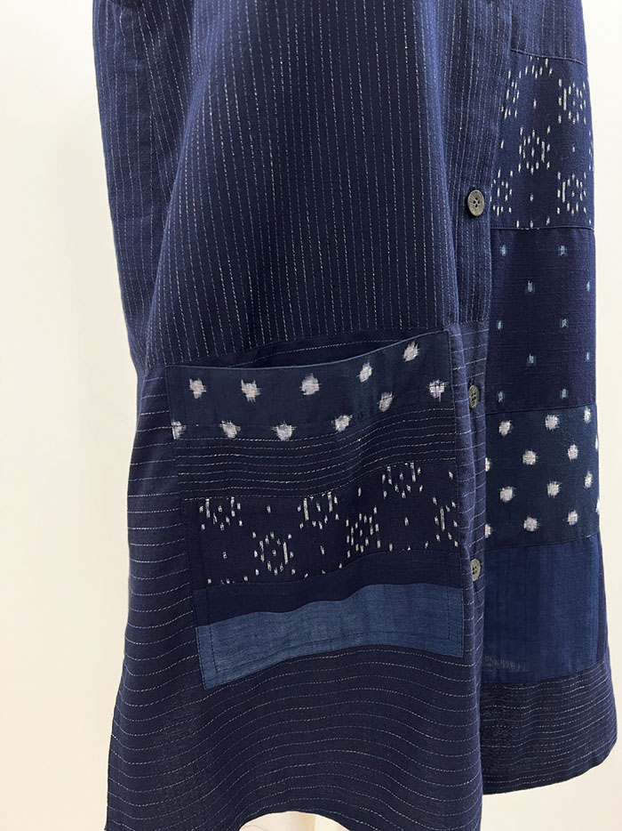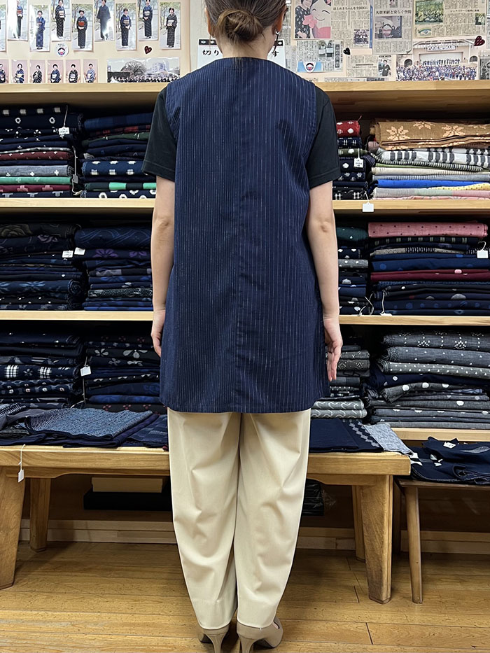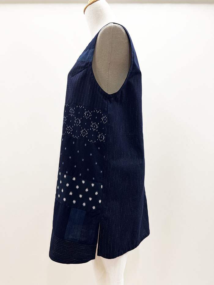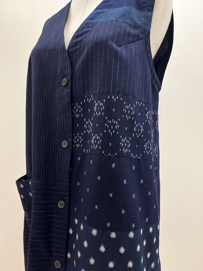 紺地の久留米絣を組み合わせて仕立てた、一点物のロングベスト(ジレ)です。
