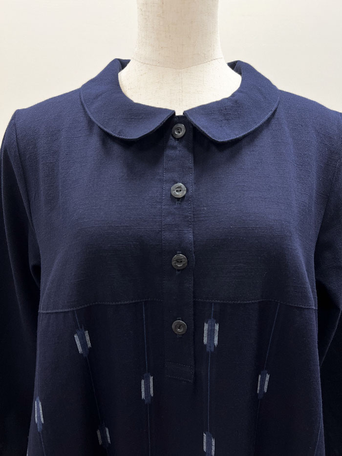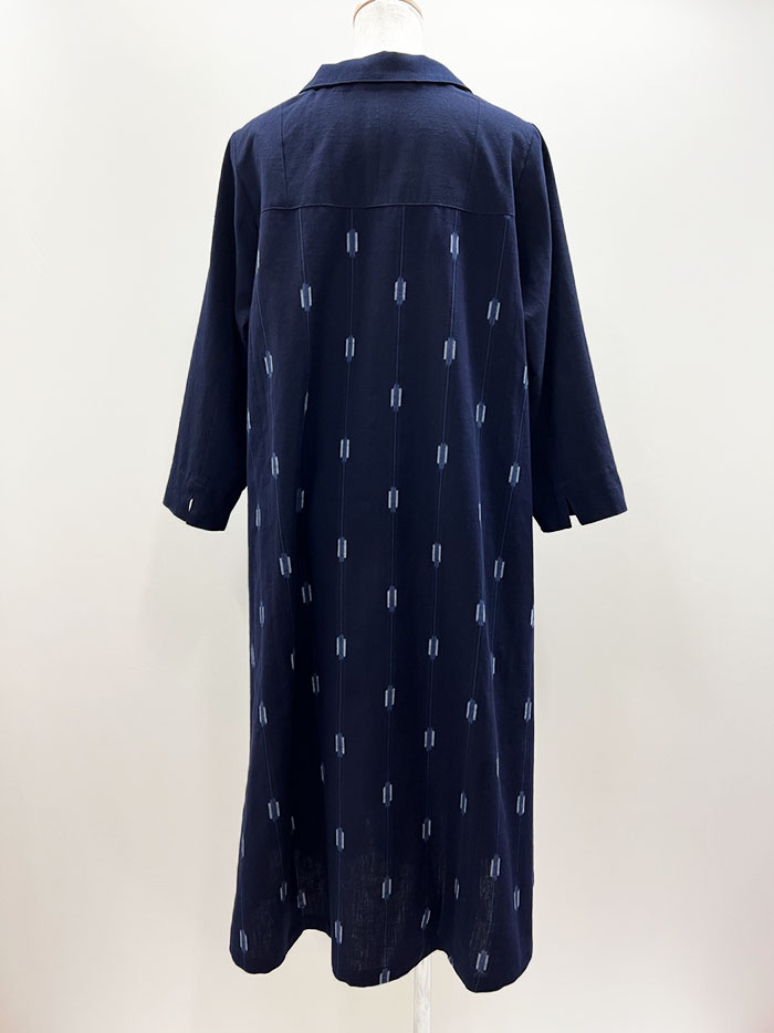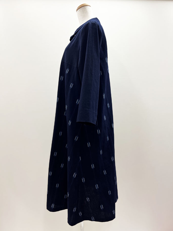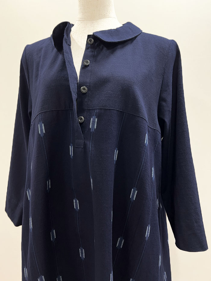 【F1215】久留米絣 襟付き胸元切り替えワンピース(ほたる 紺/ブルー)