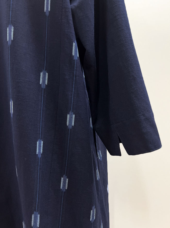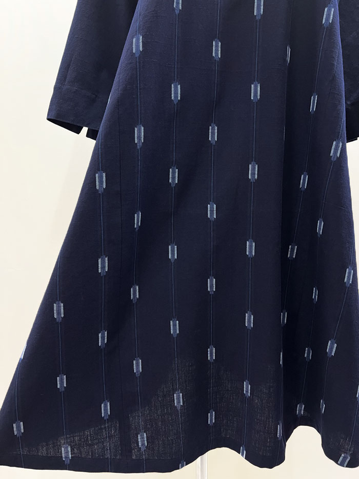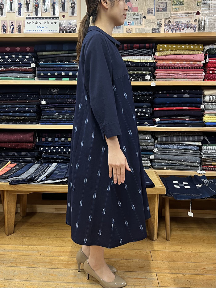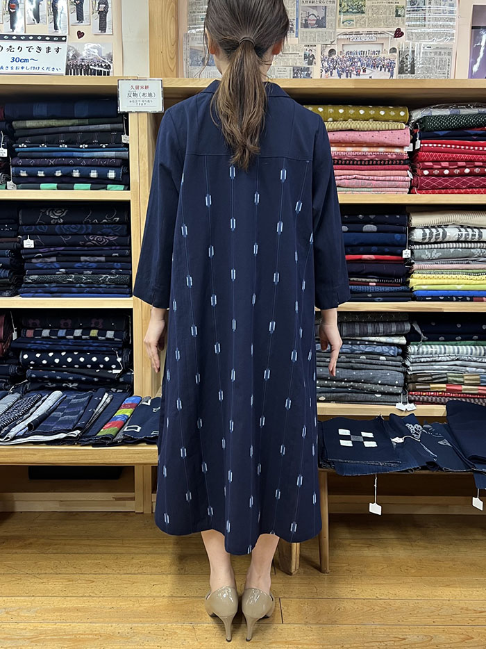 「濃紺無地」と「紺地にブルーのほたる柄」の久留米絣で仕立てた、襟付きワンピースです。