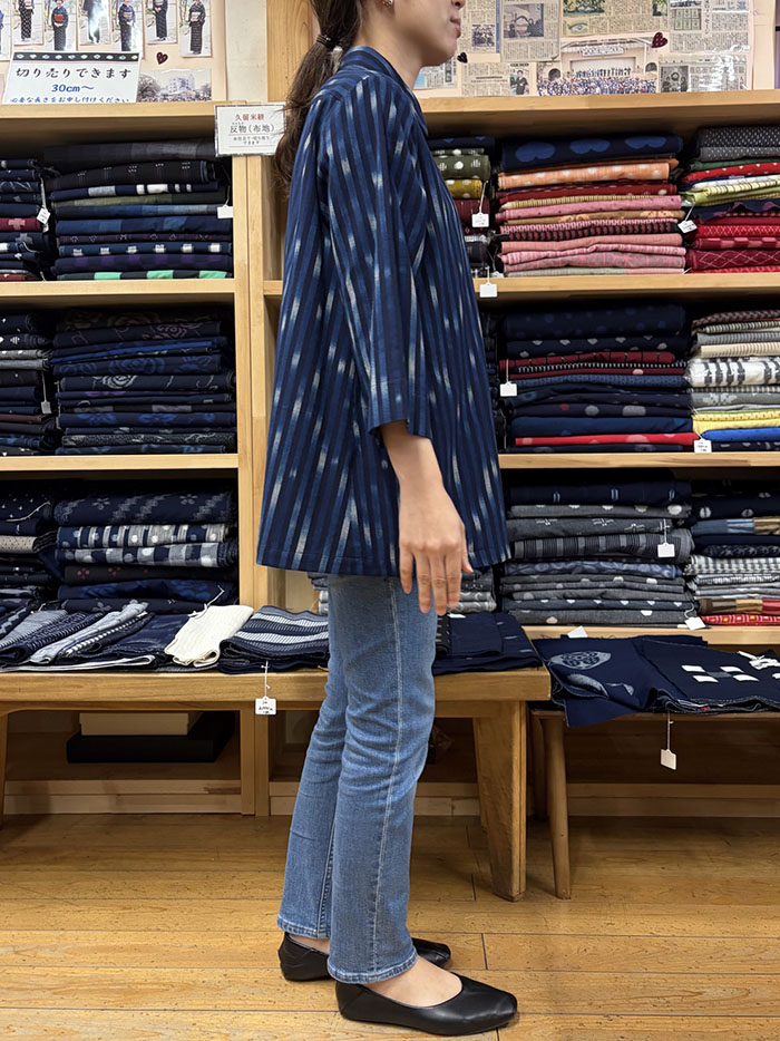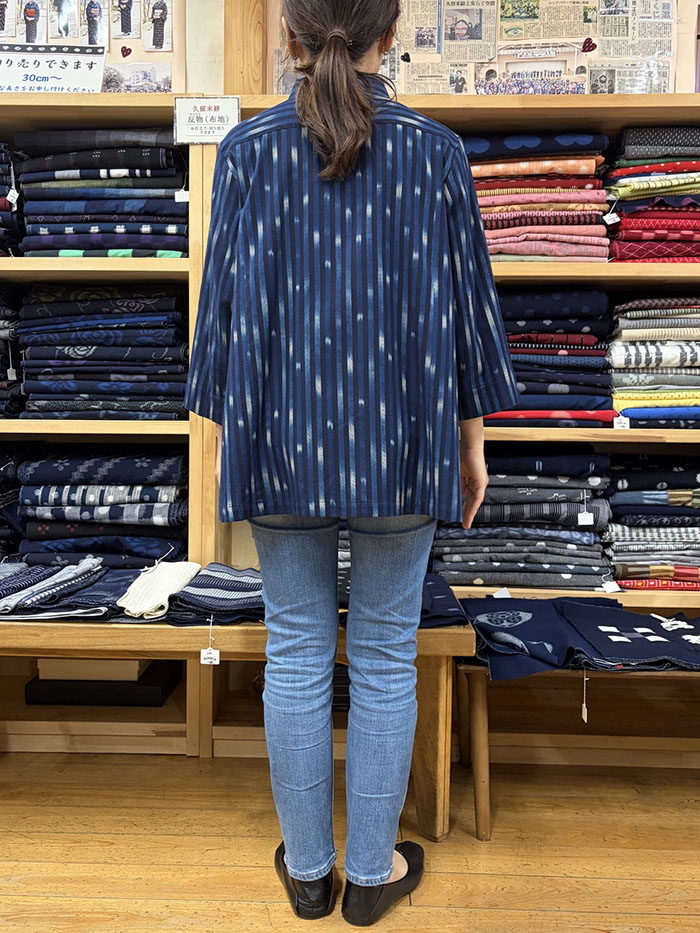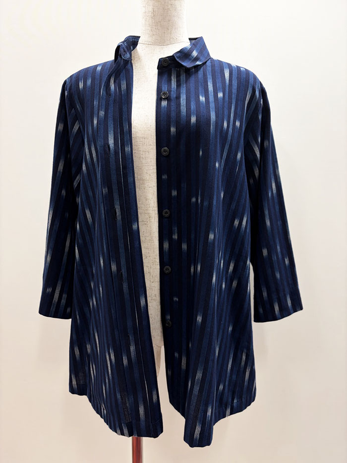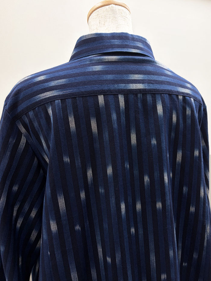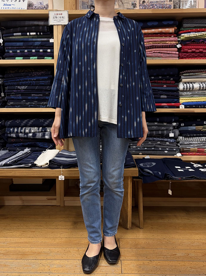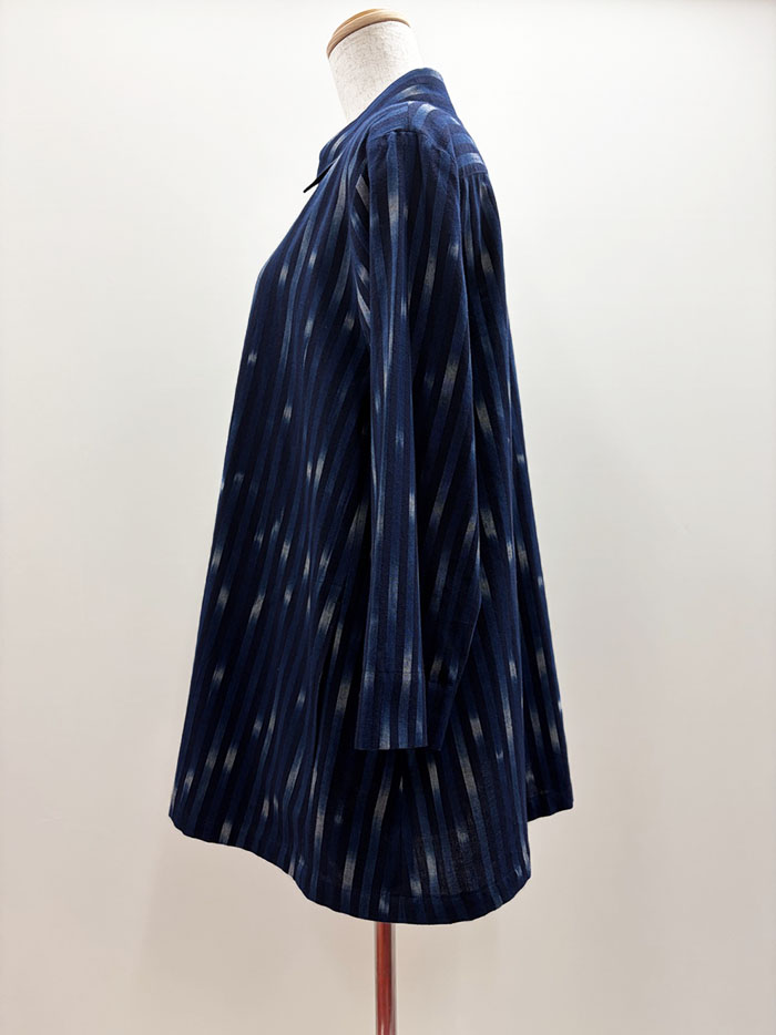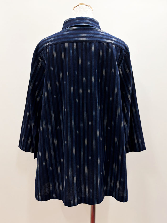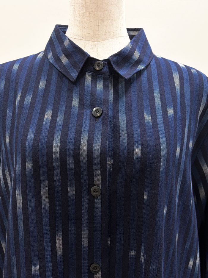 シンプルなデザインでスッキリした印象の、久留米絣(藍ぼかし染めストライプネイビー)のブラウスです。