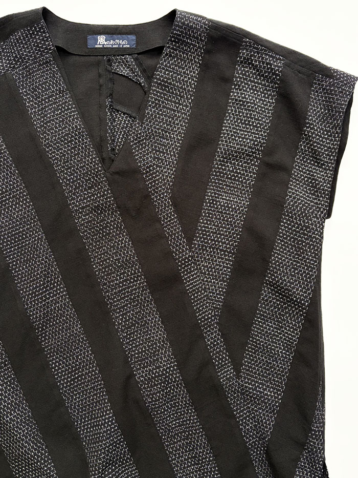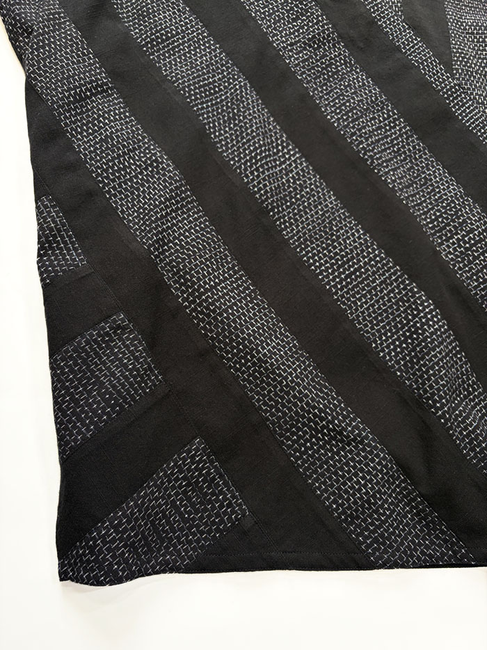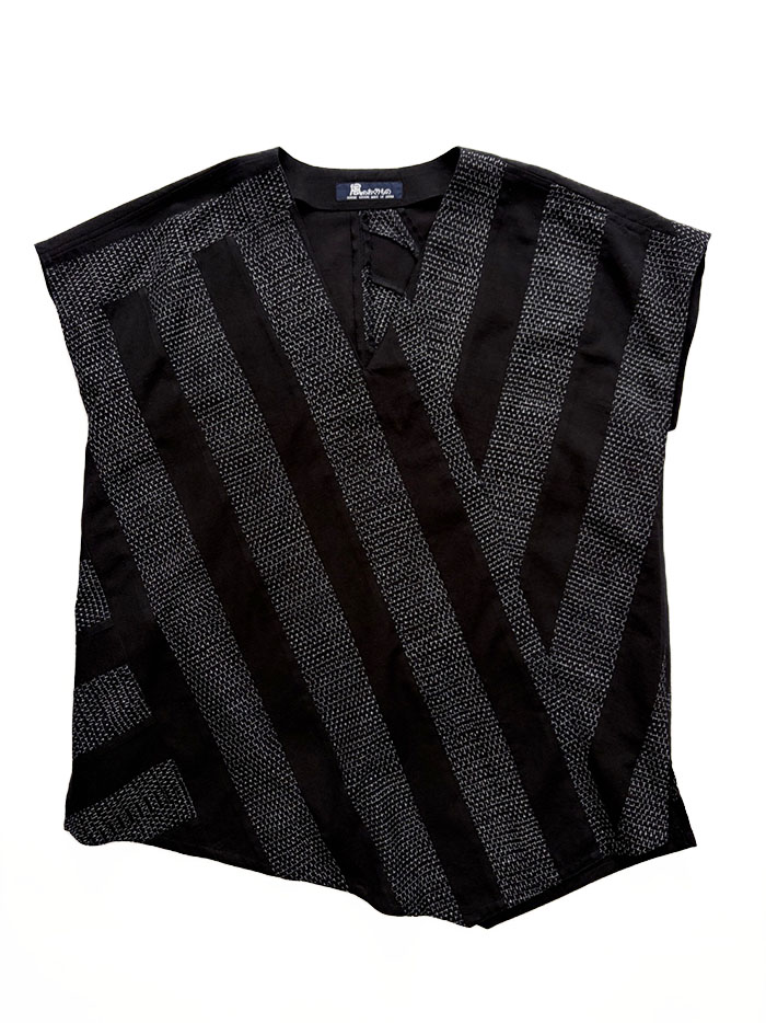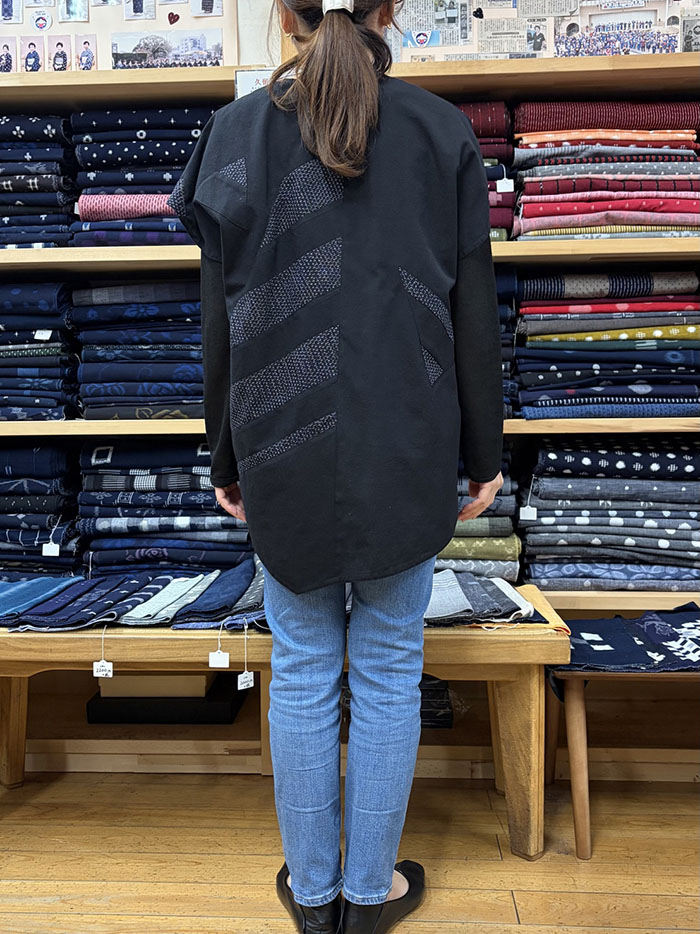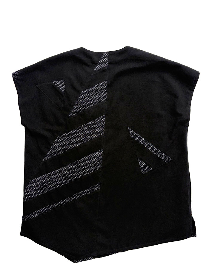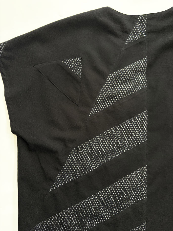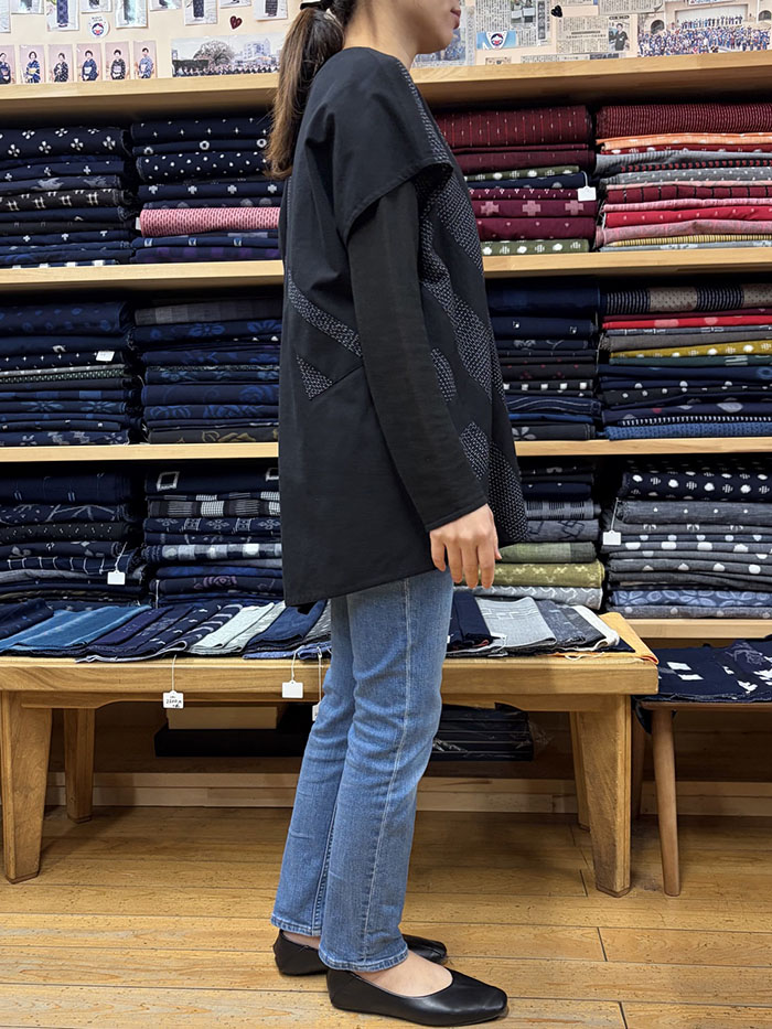 蚊絣文人柄(黒地)と黒無地の久留米絣のパッチワークが素敵な、一点物のプルオーバーブラウス(かぶりブラウス)です。