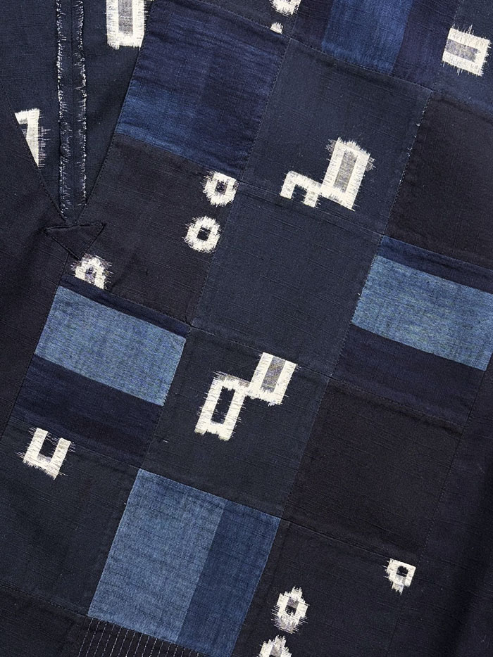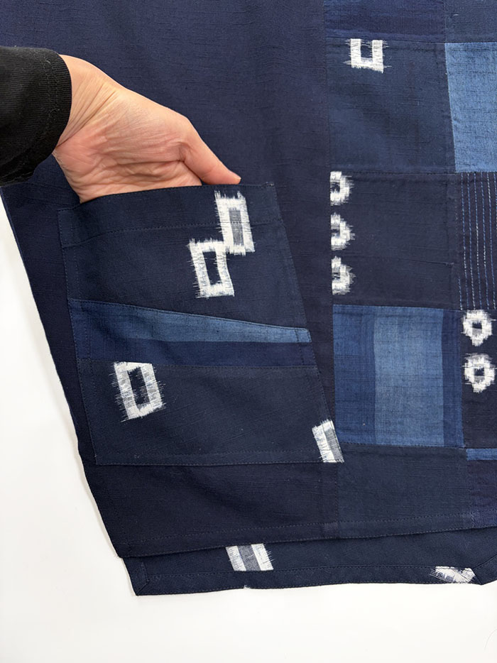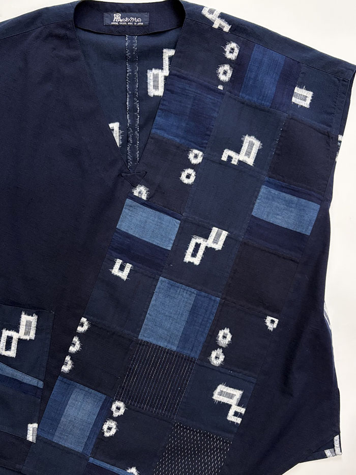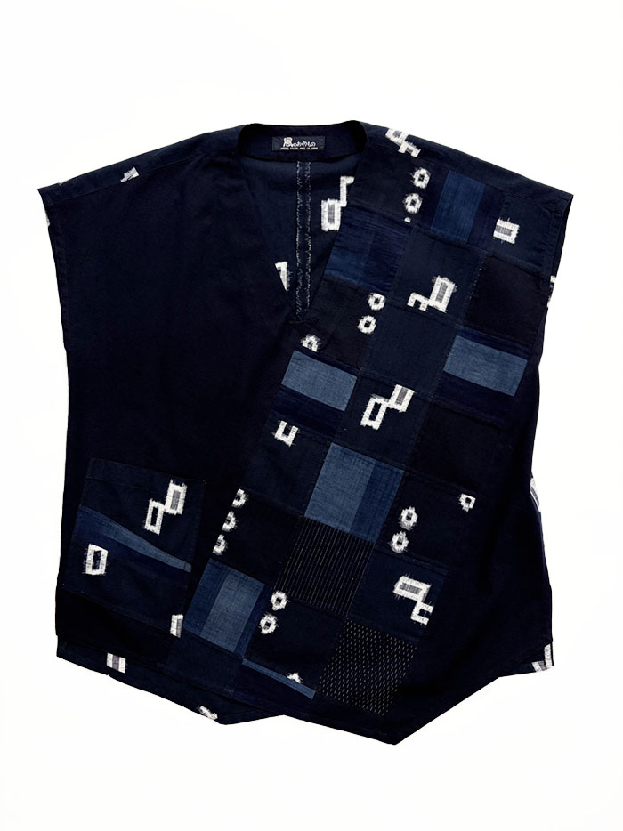 紺色、藍色の久留米絣のパッチワークが素敵な、一点物のプルオーバーブラウス(かぶりブラウス)です。