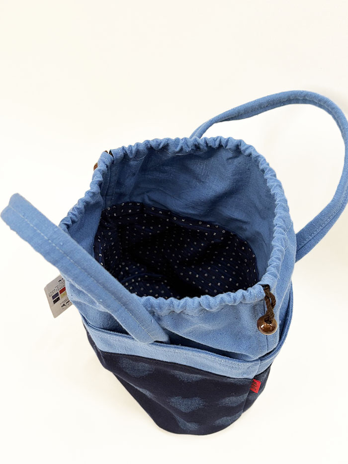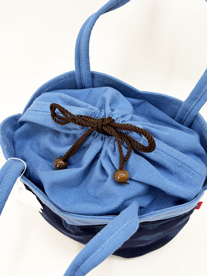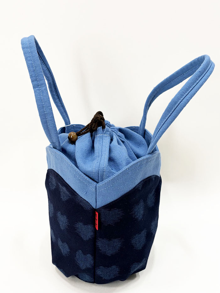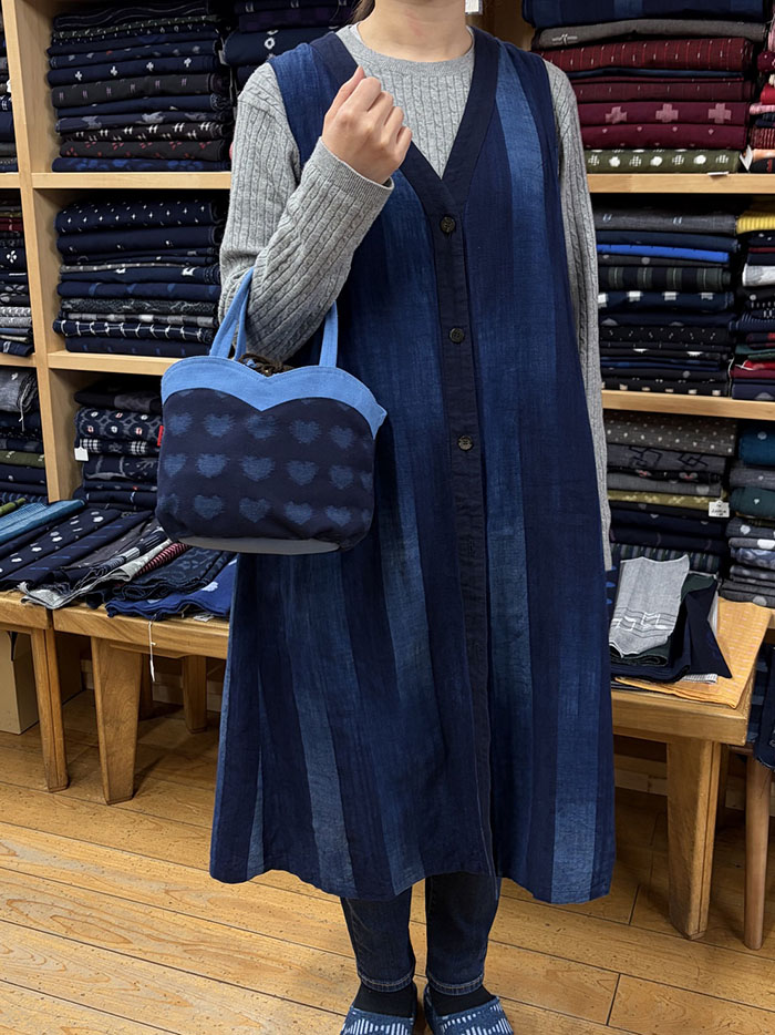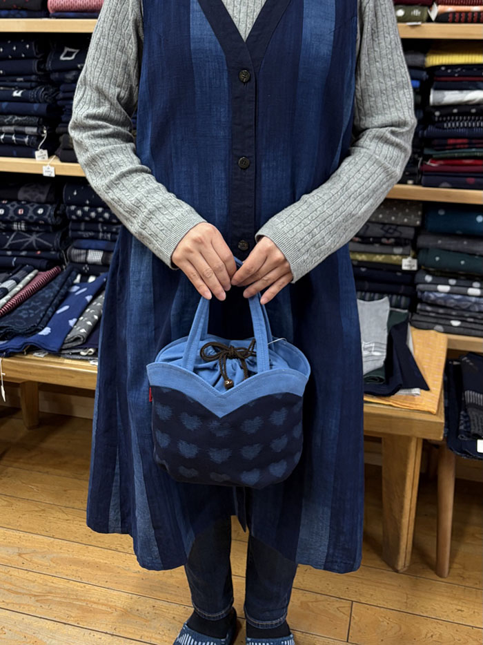 ハート柄の久留米絣が可愛らしく、ころんとしたシルエットが可愛い手提げバッグです。