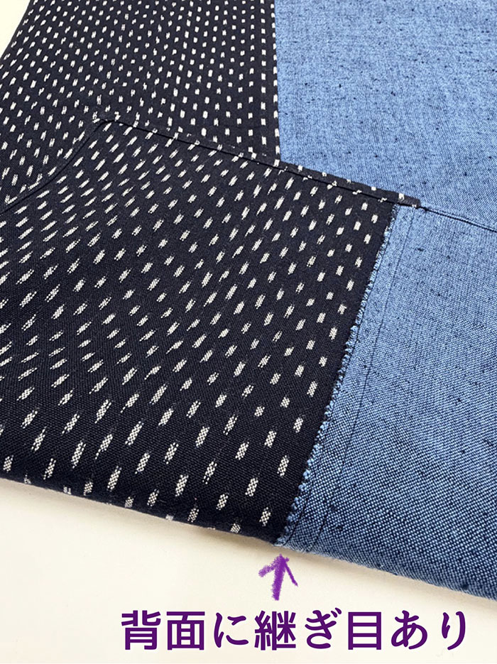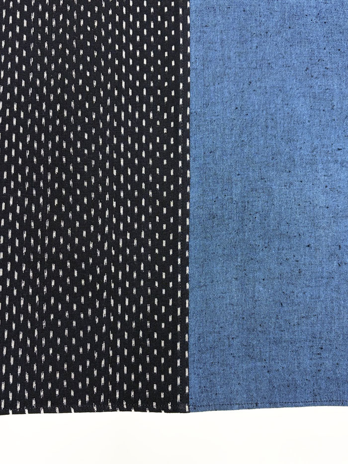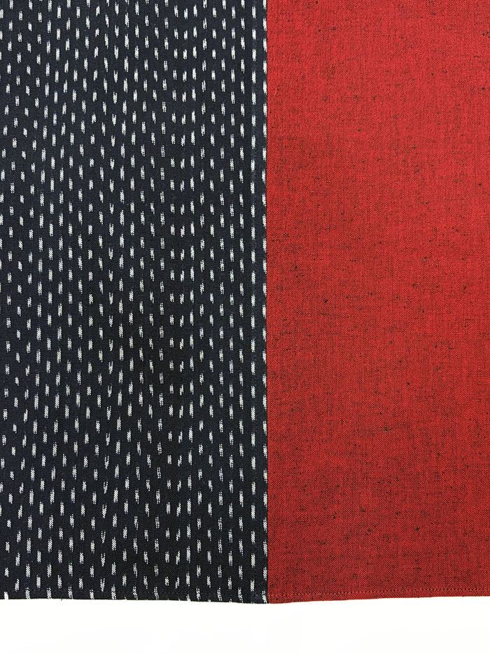 水色、赤の久留米絣無地と、濃紺地に白のあられ柄の久留米絣を組み合わせて仕立てた小風呂敷です。