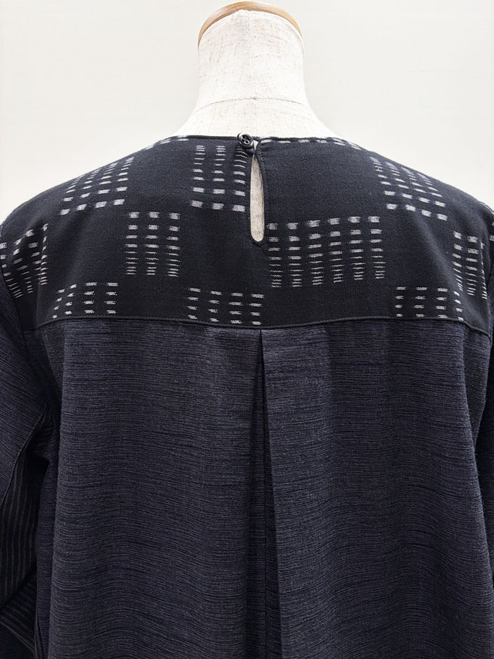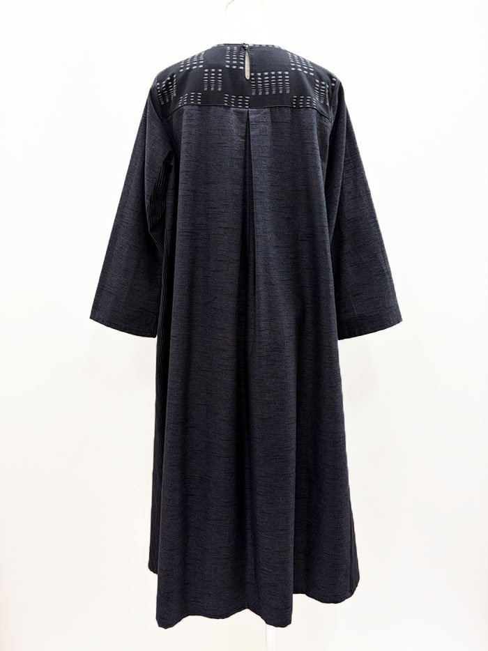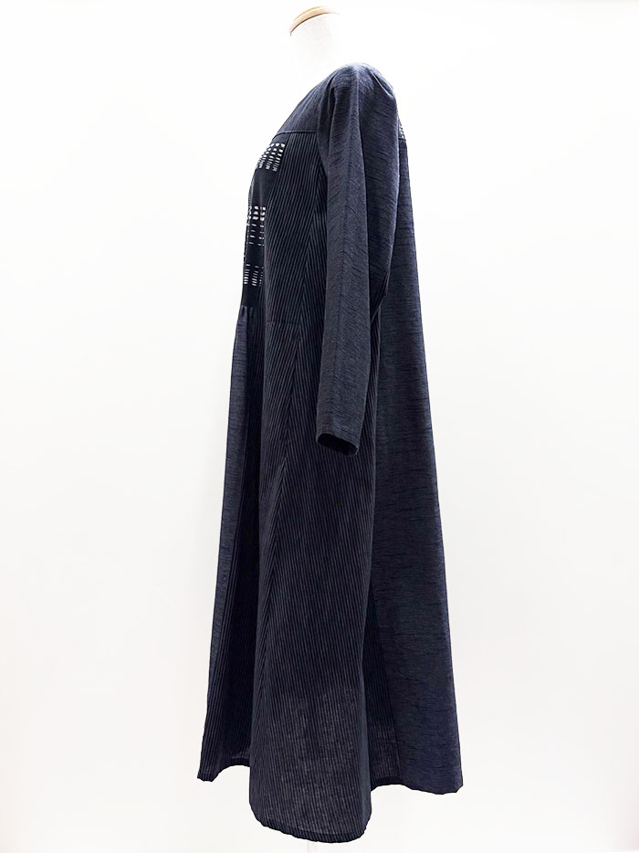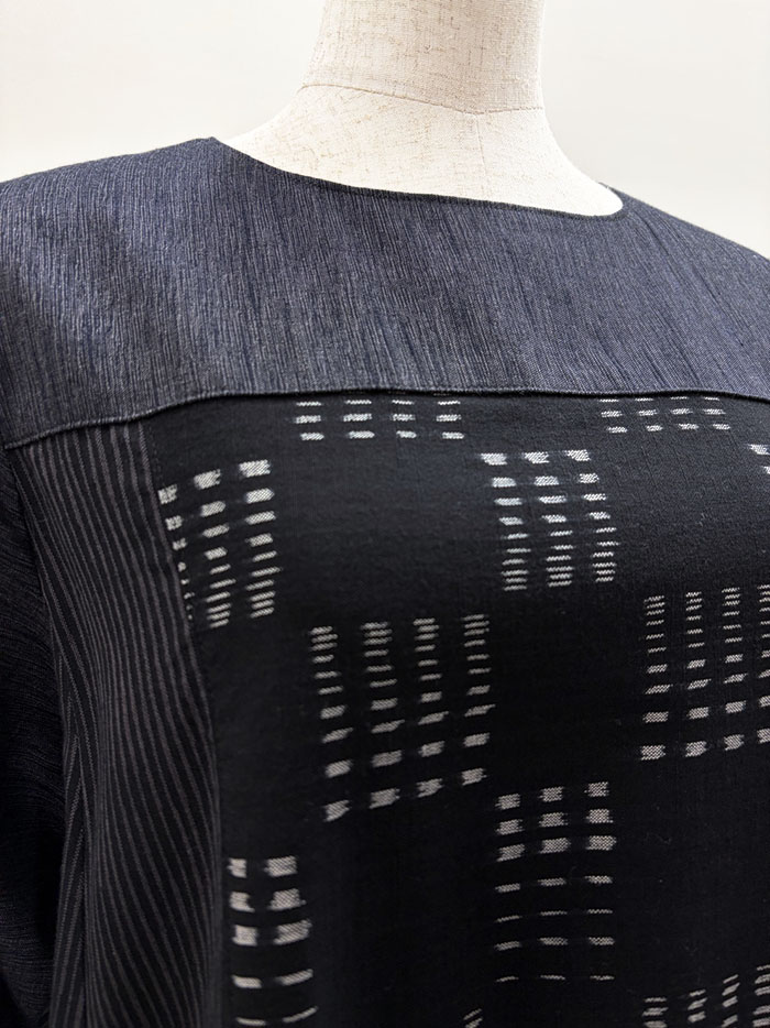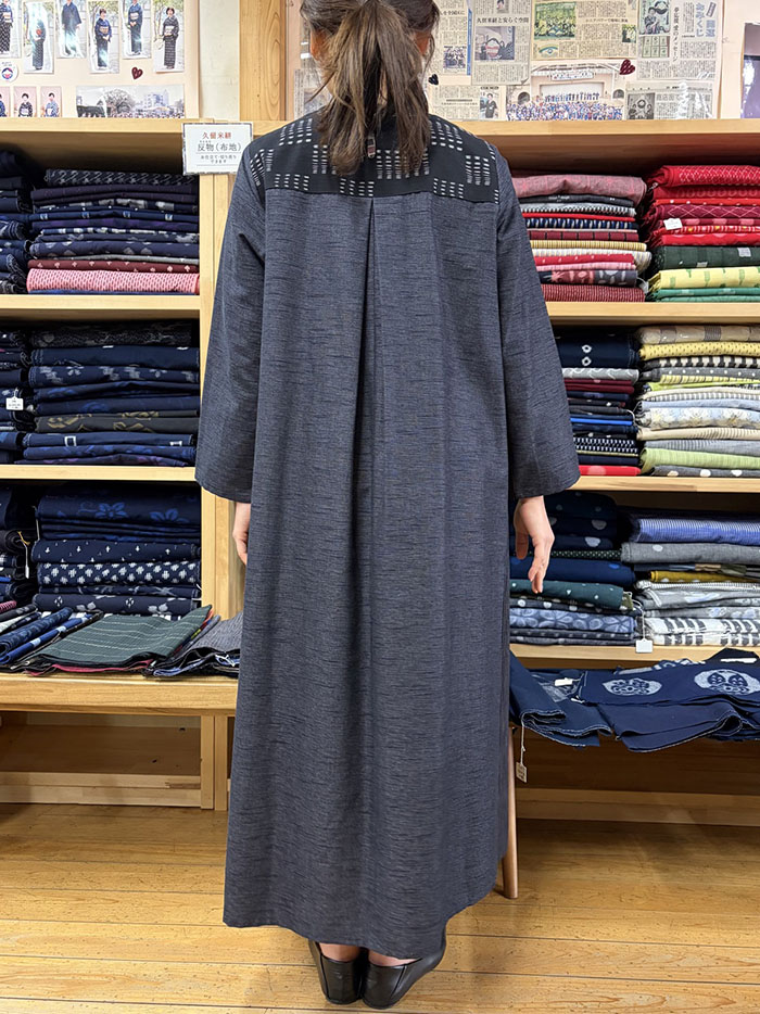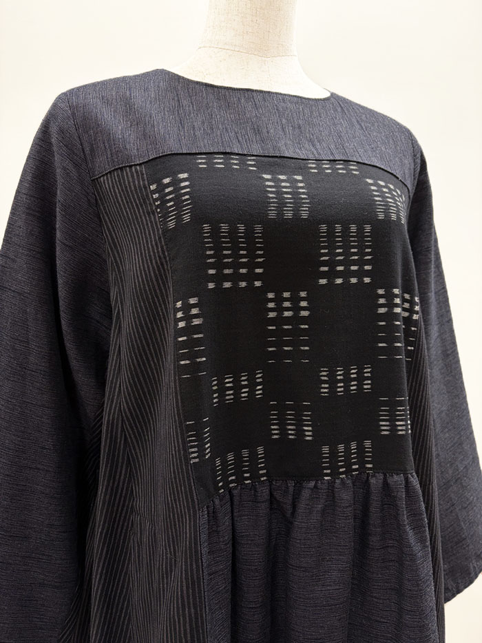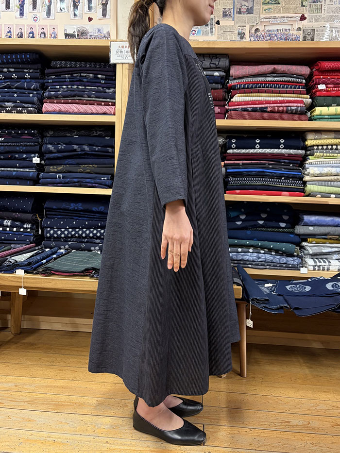 無地、しま、柄の3種類の久留米絣を組み合わせて仕立てられたワンピースです。