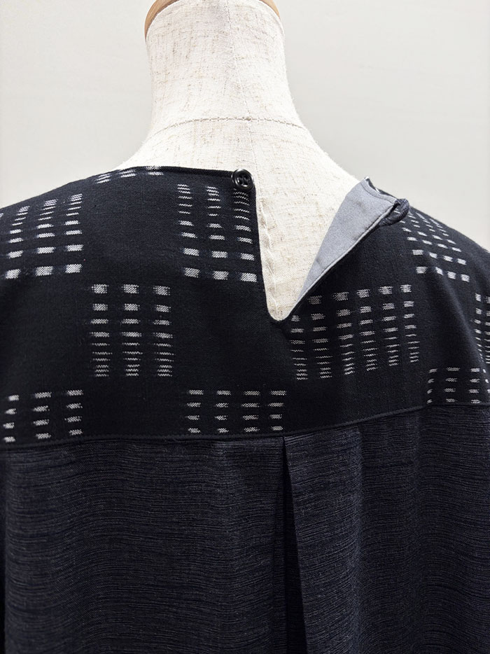 背面首元のボタンを外して頭からかぶって着用するデザインです。