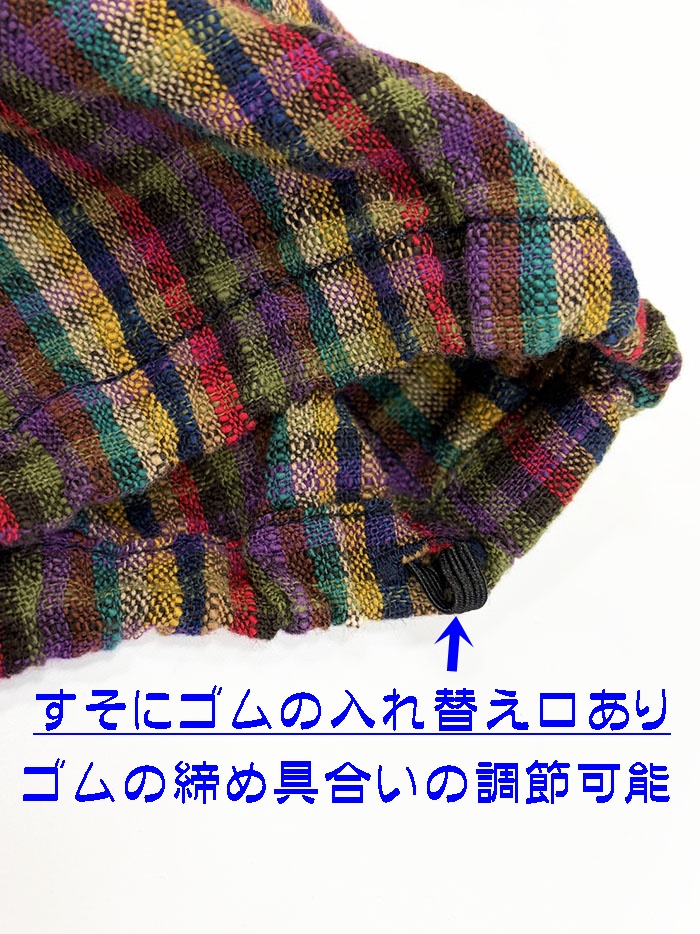 裾のゴムは少し絞った仕様ですが、ゴムの入れ替え口があるためゴムは抜くこともできます。