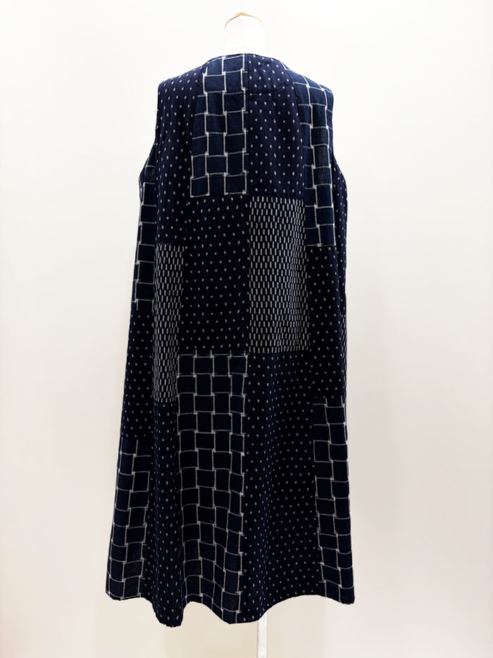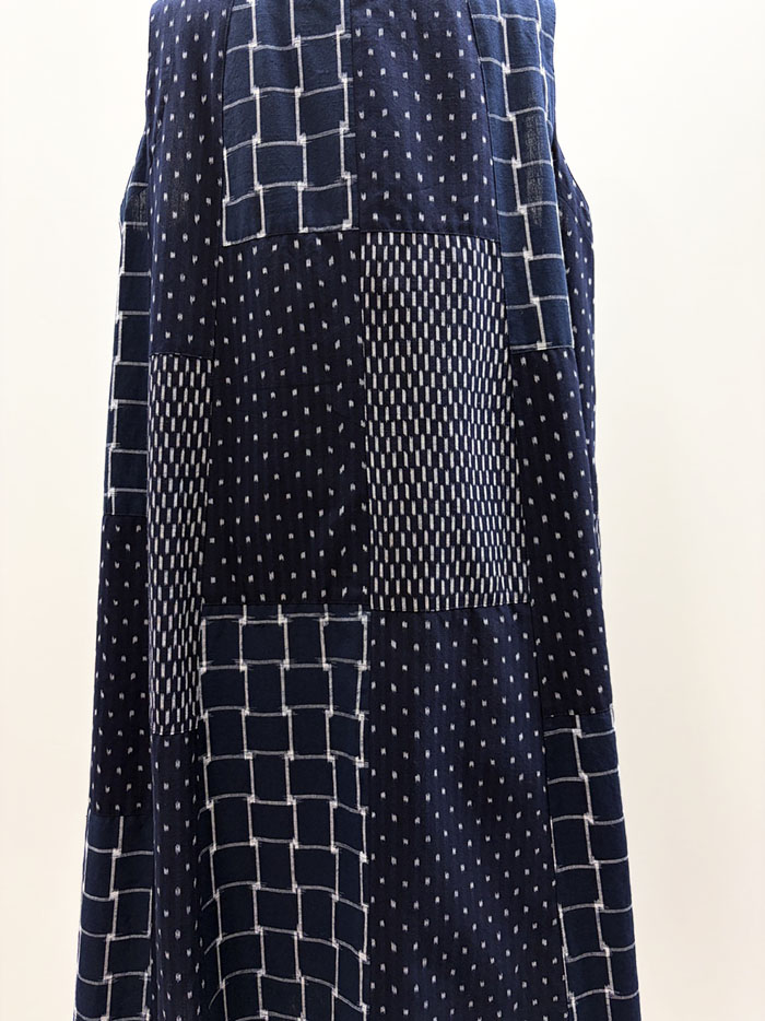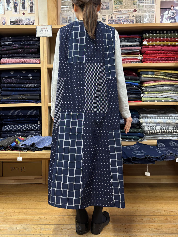 前開きタイプの、久留米絣のパッチワークロングベストです。