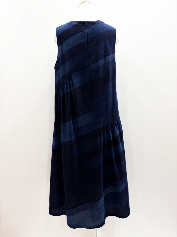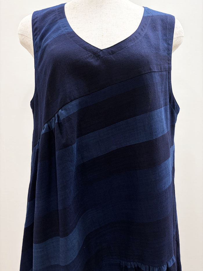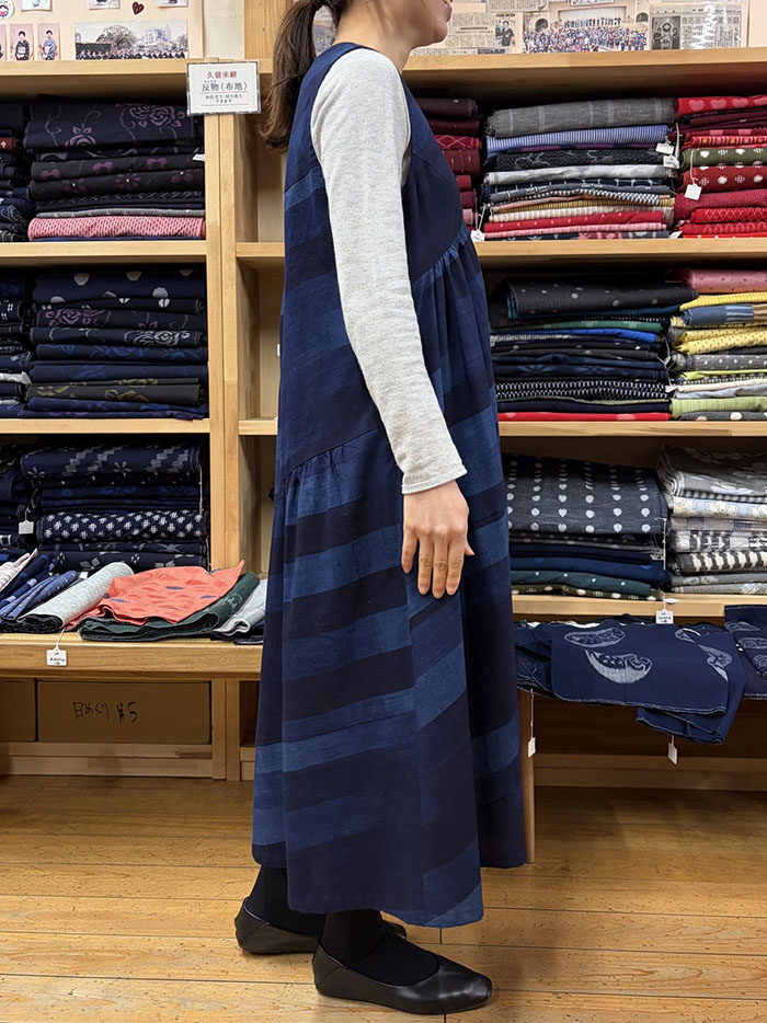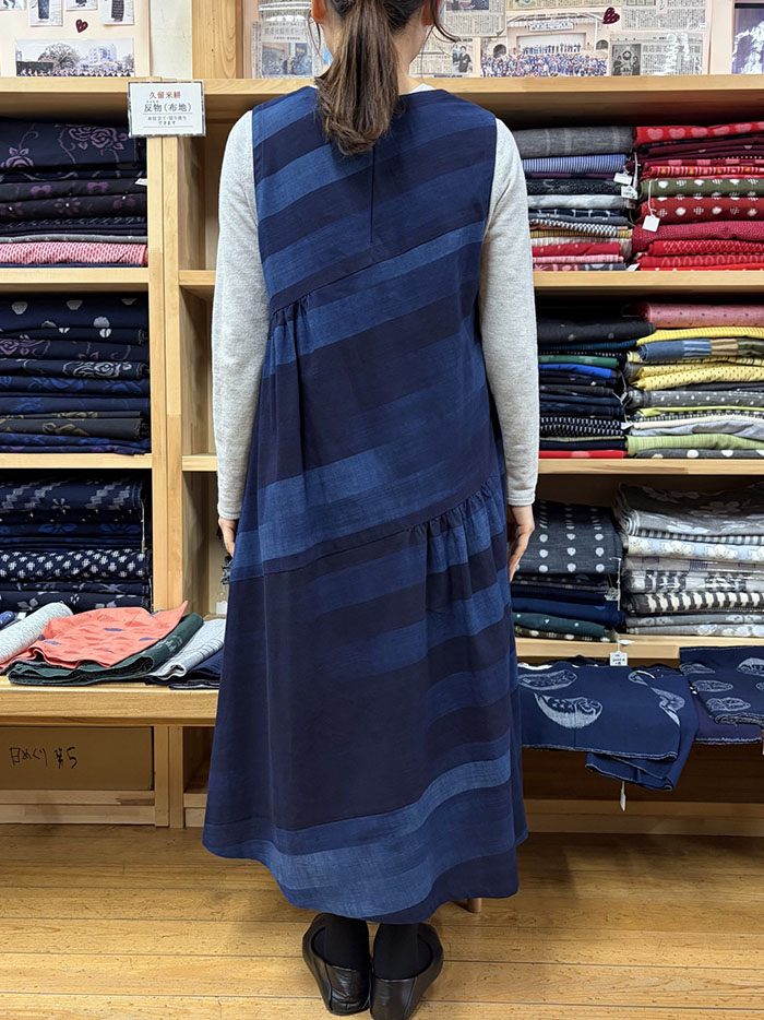 藍色のグラデーションが素敵な久留米絣の生地を斜めに使用して切り替え、ところどころにギャザーをよせたふんわりシルエットが素敵です。