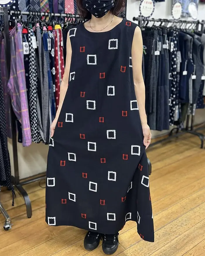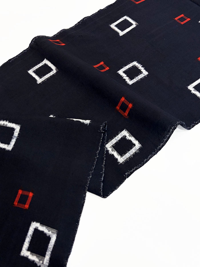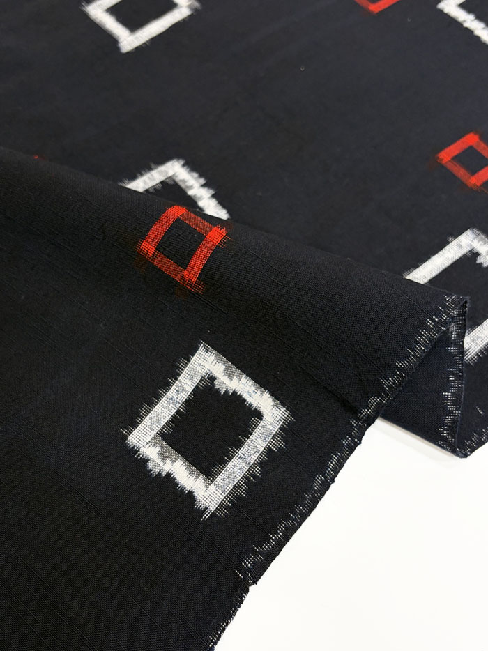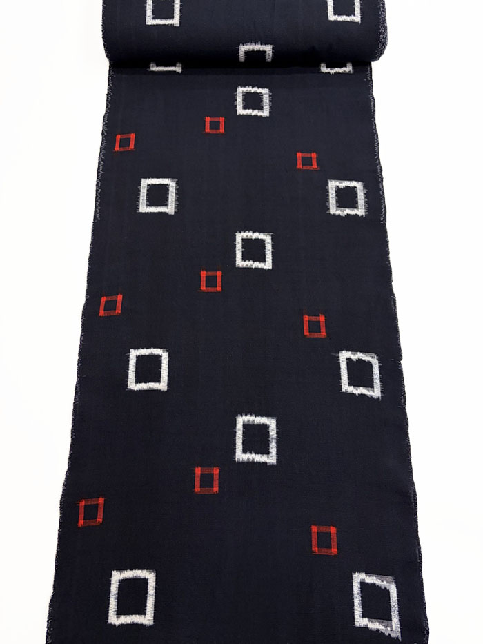 黒紺地(タテ糸が黒、ヨコ糸が紺で織られた黒に近い濃紺)に白と赤の模様が入っています。