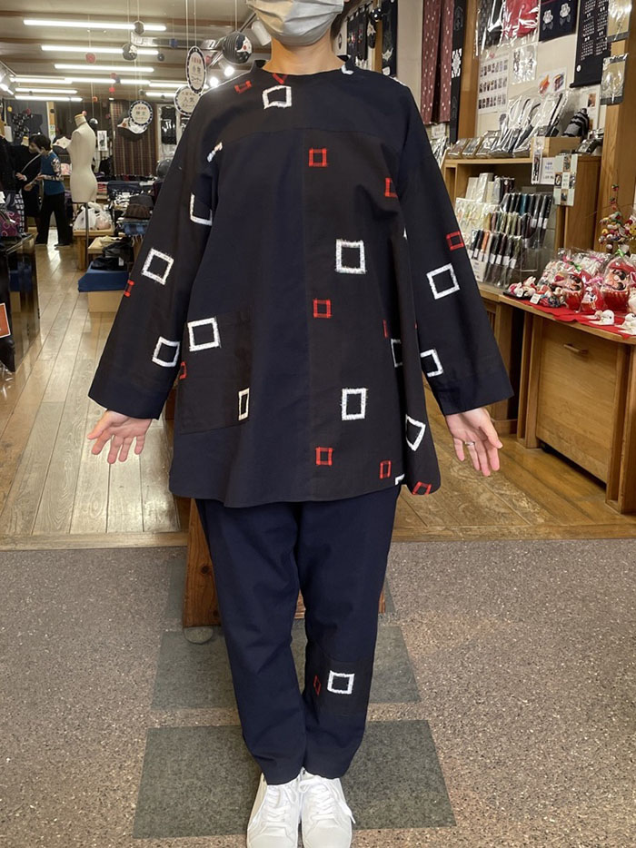 【こちらの反物で仕立てた洋服やのれんの一例】