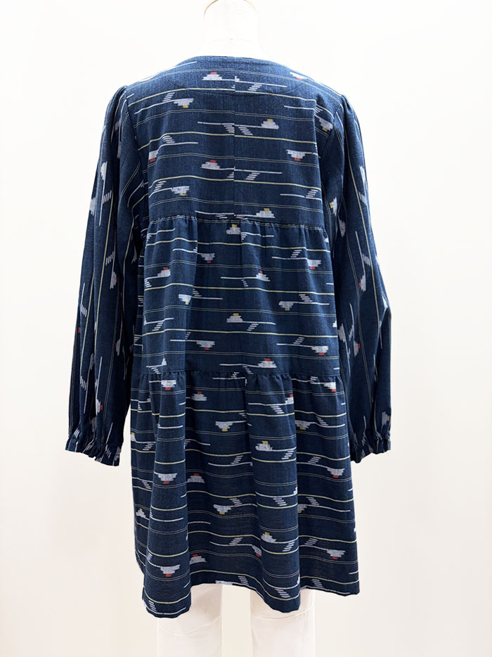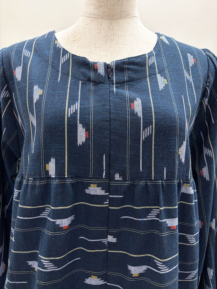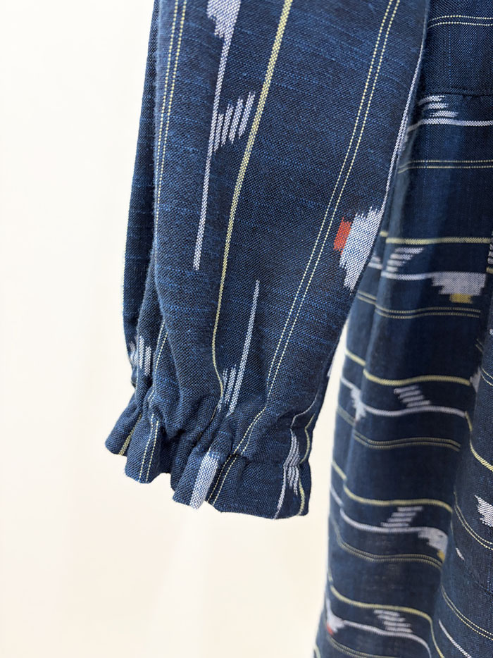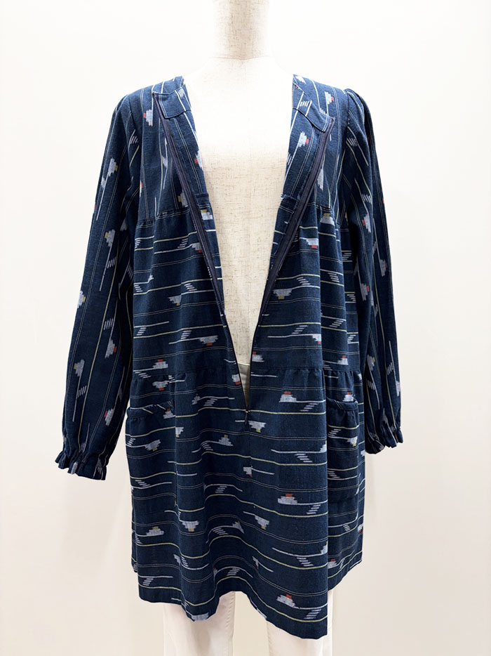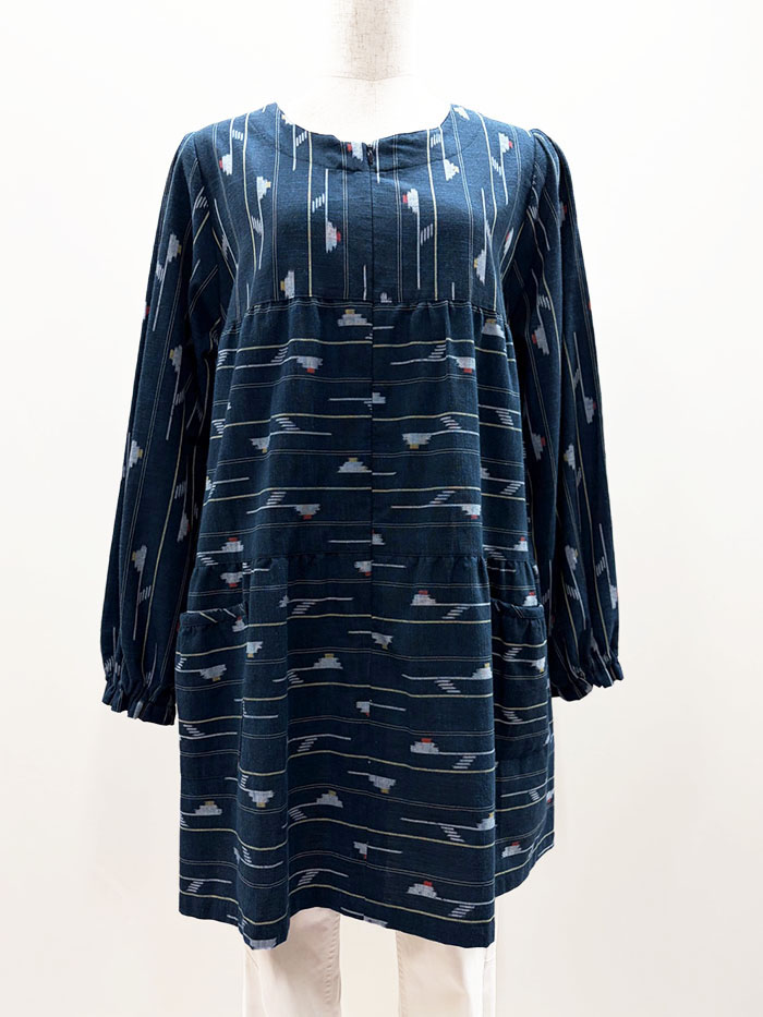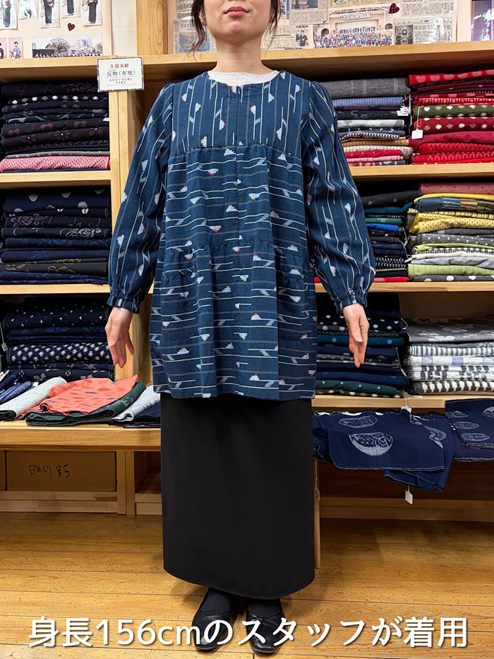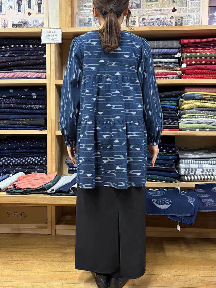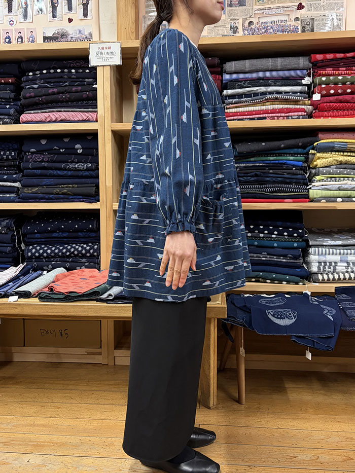 三段切り替えで、ふんわりしたシルエットが可愛い久留米絣の割烹着ブラウスです。