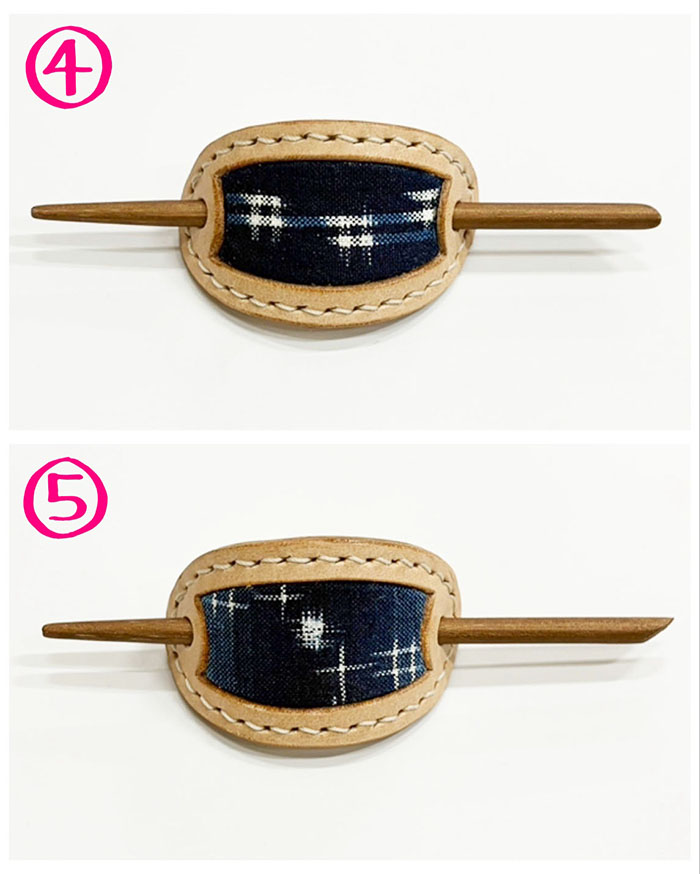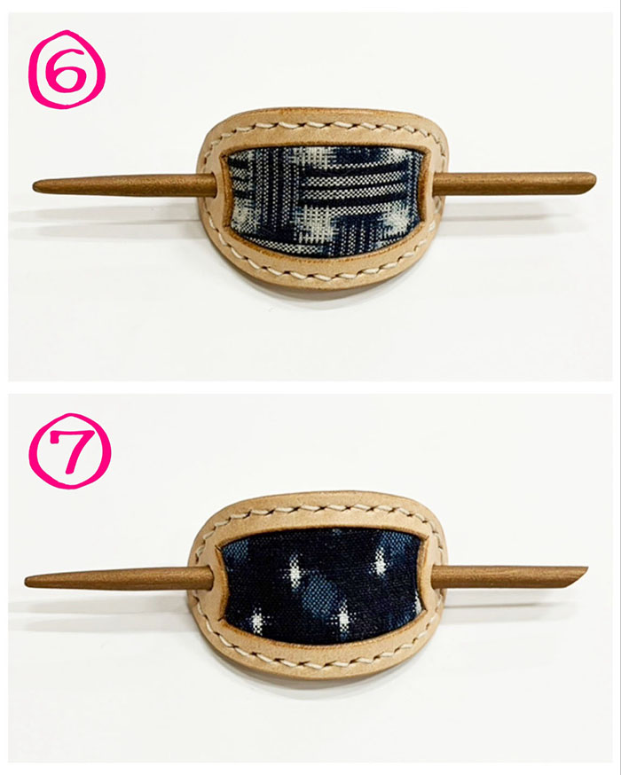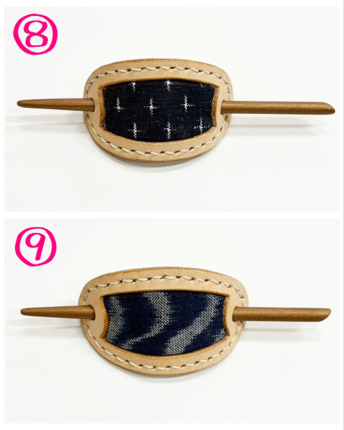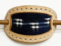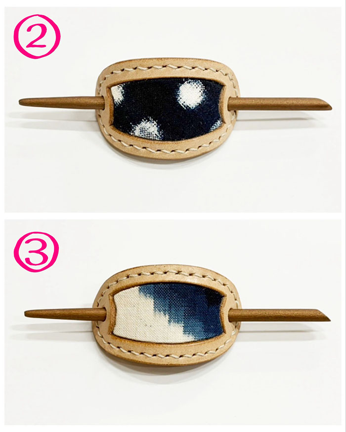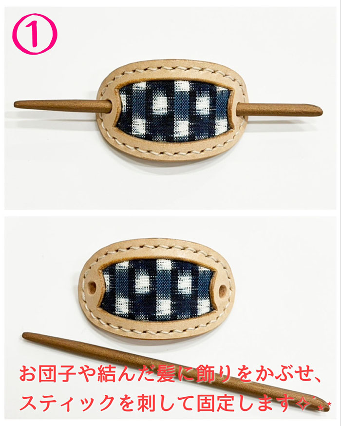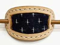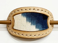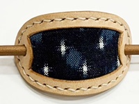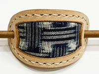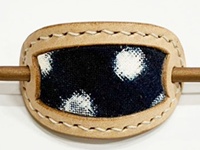 貴重な「藍染・手織りの久留米絣」と、国産牛革のマジェステ(髪飾り)です。