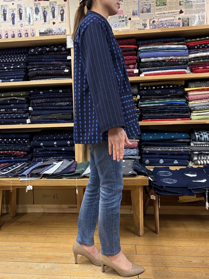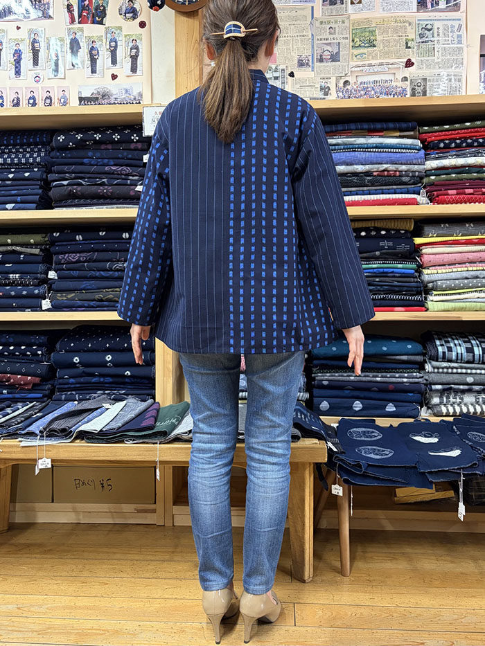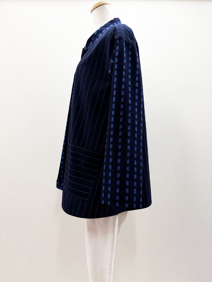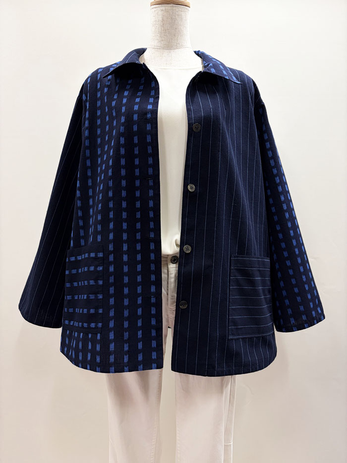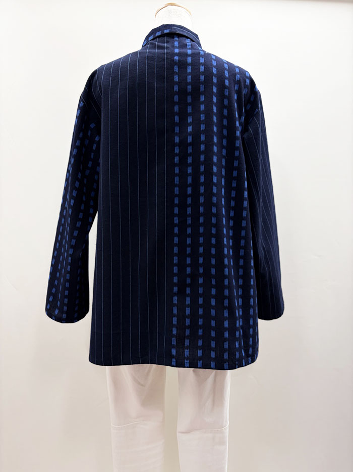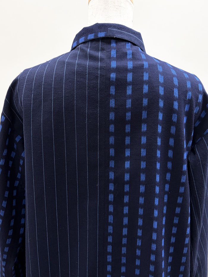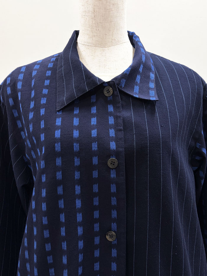 「紺地のストリートアラレブルー」と「紺地に水色のストライプ」の二種類の生地を組み合わせて仕立てたブラウスです。