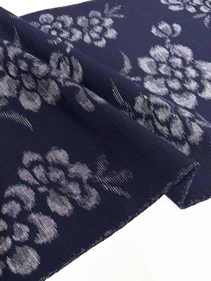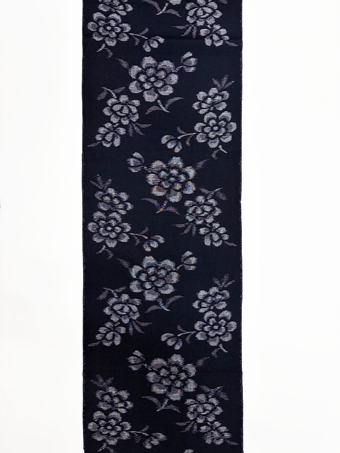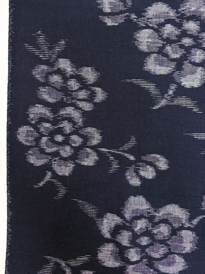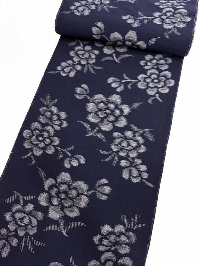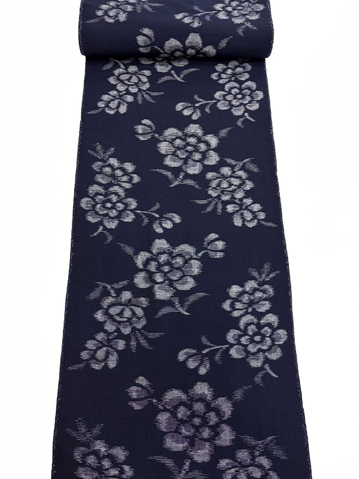濃紺地に白の牡丹(ぼたん)柄の素敵な久留米絣の反物です。