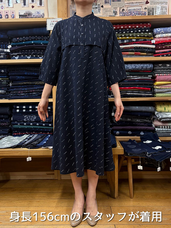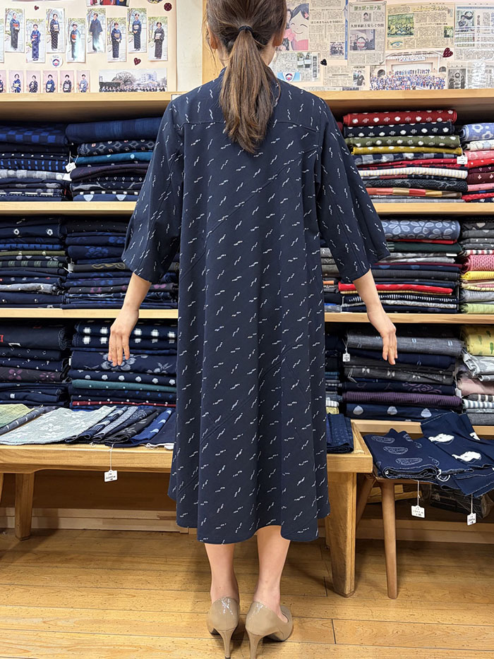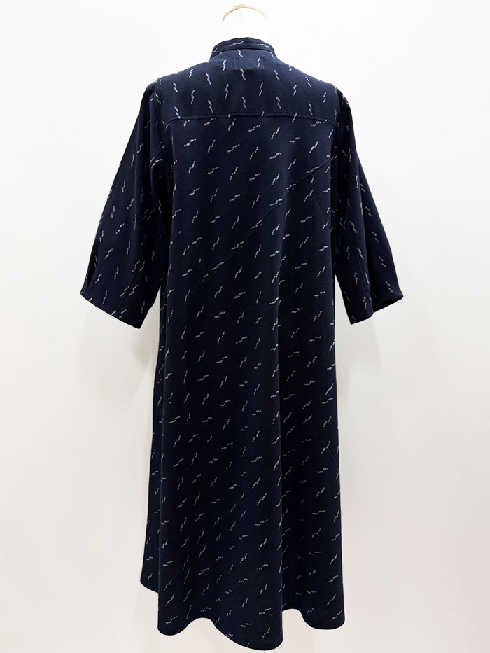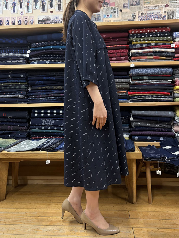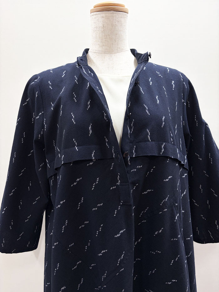 濃紺地に白の模様が上品な、久留米絣のワンピースです。