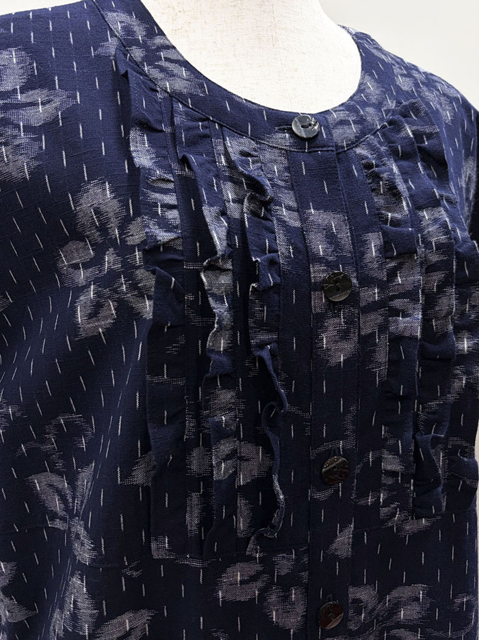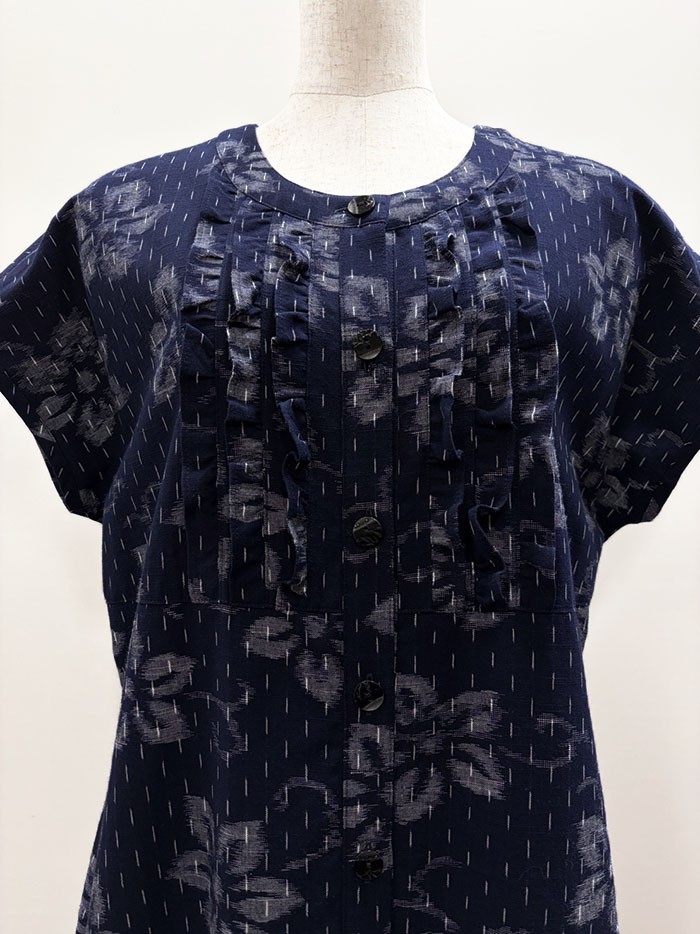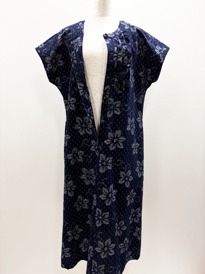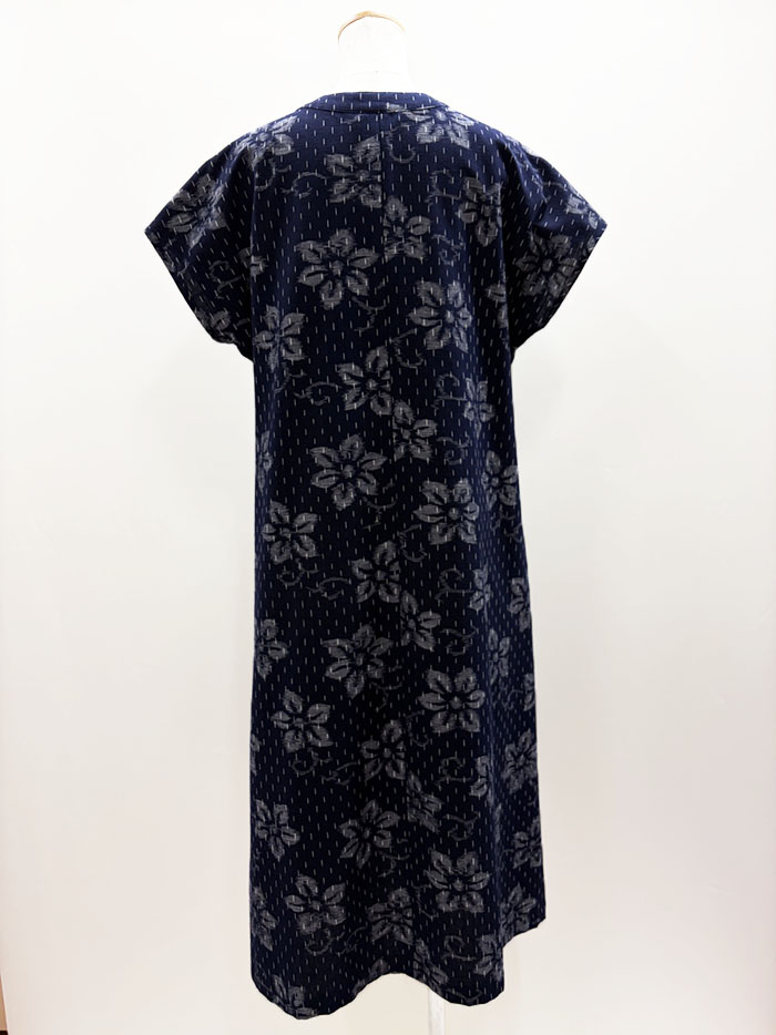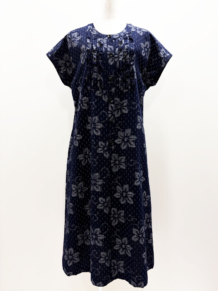 【F1392】藍暦 胸元フリル 半袖ワンピース(花柄 紺地)